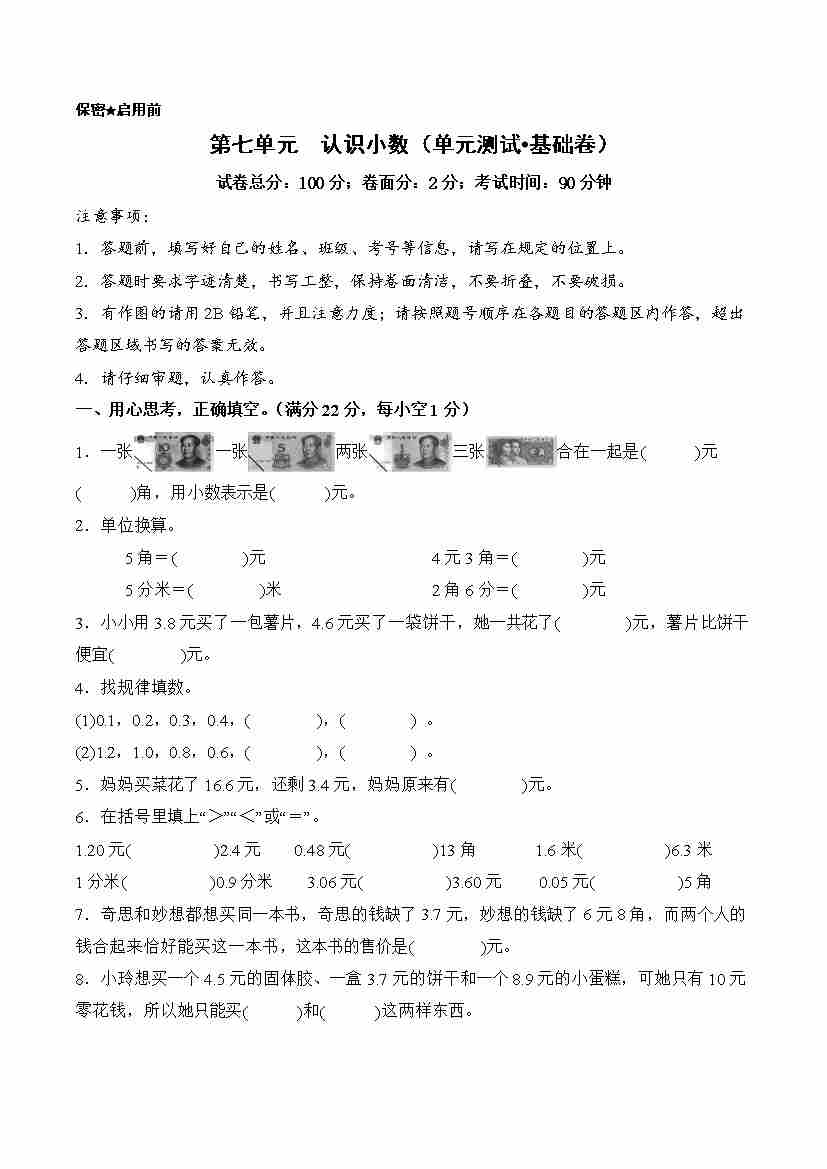 第七单元 认识小数(单元测试 基础卷) (A4版)
