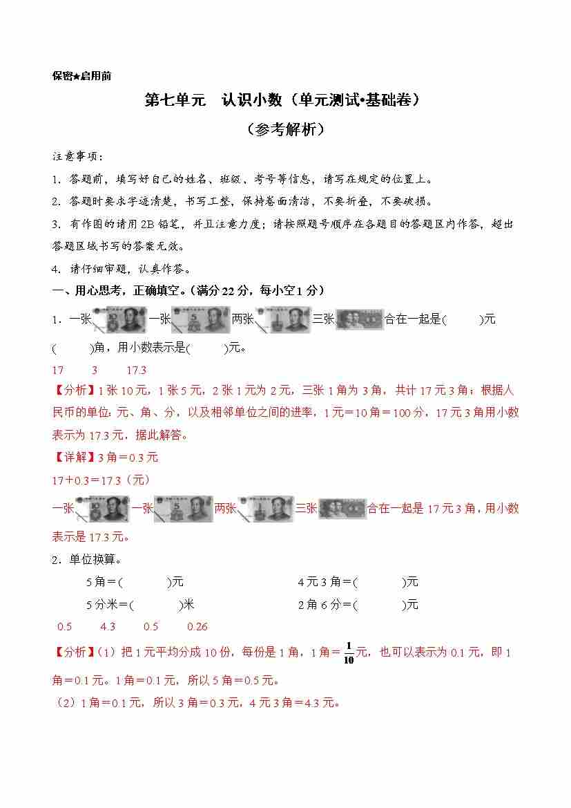 第七单元 认识小数(单元测试 基础卷) (参考解析)