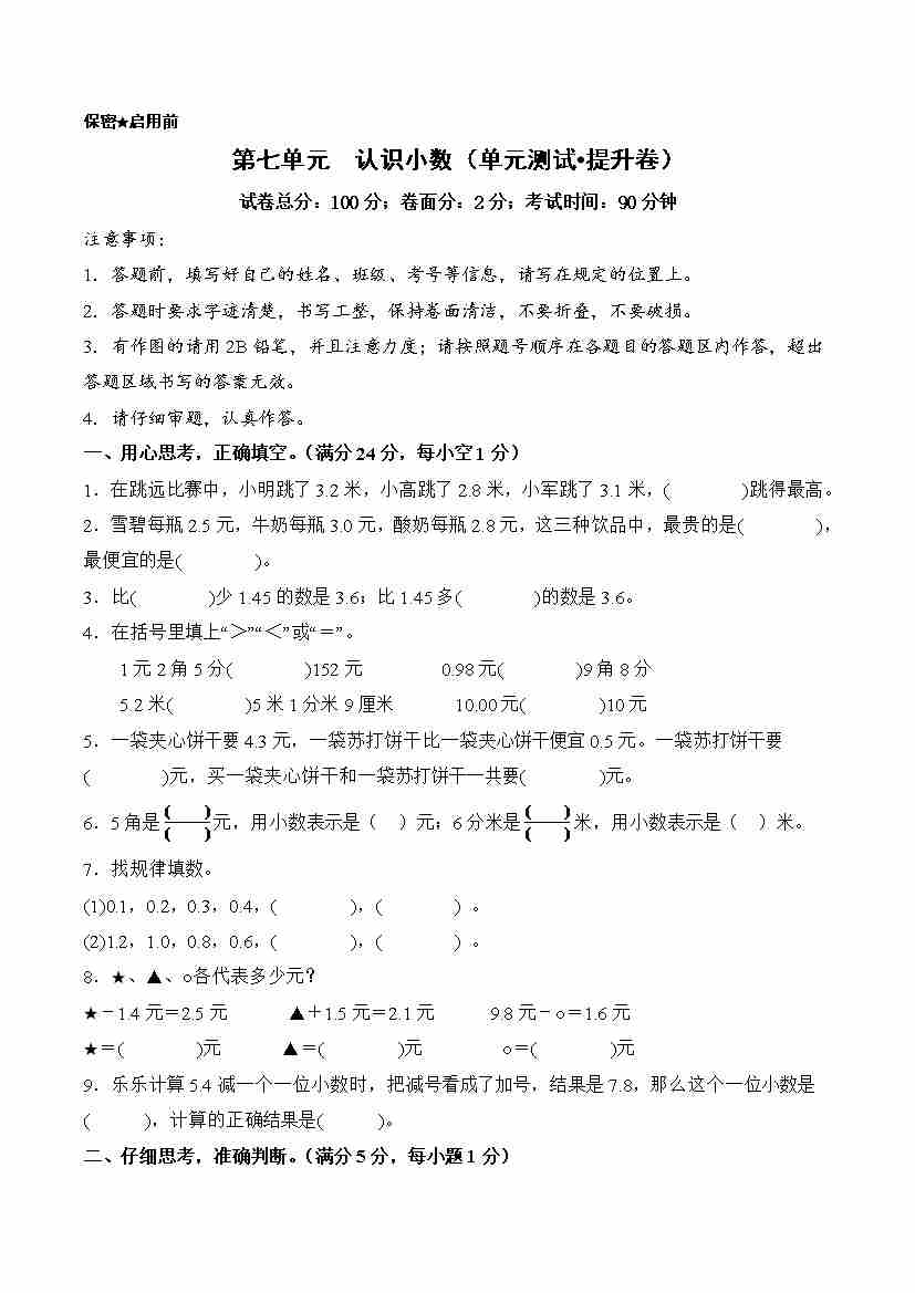 第七单元 认识小数(单元测试 提升卷) (A4版)