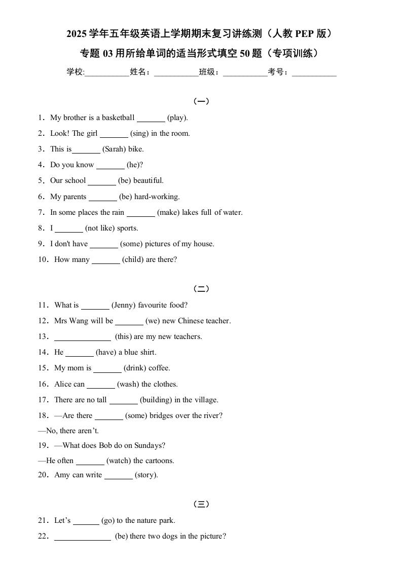 专题03用所给单词的适当形式填空50题(专项训练)五年级英语上学期期末复习讲练测(人教PEP版)1
