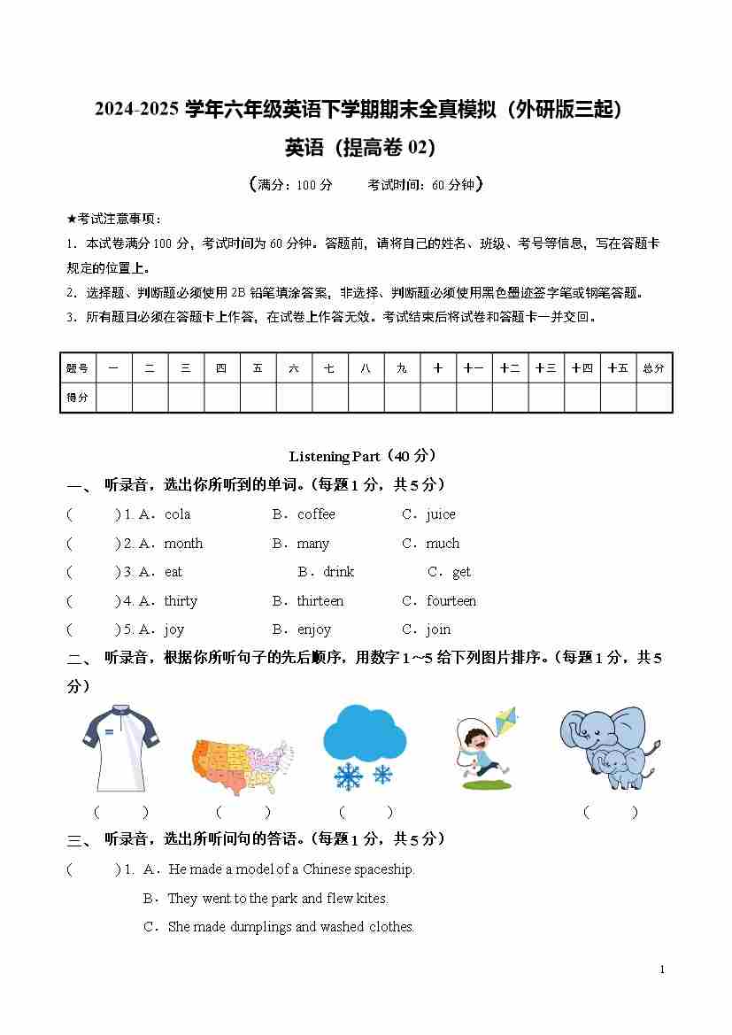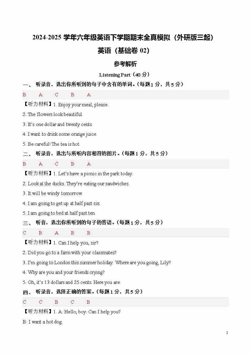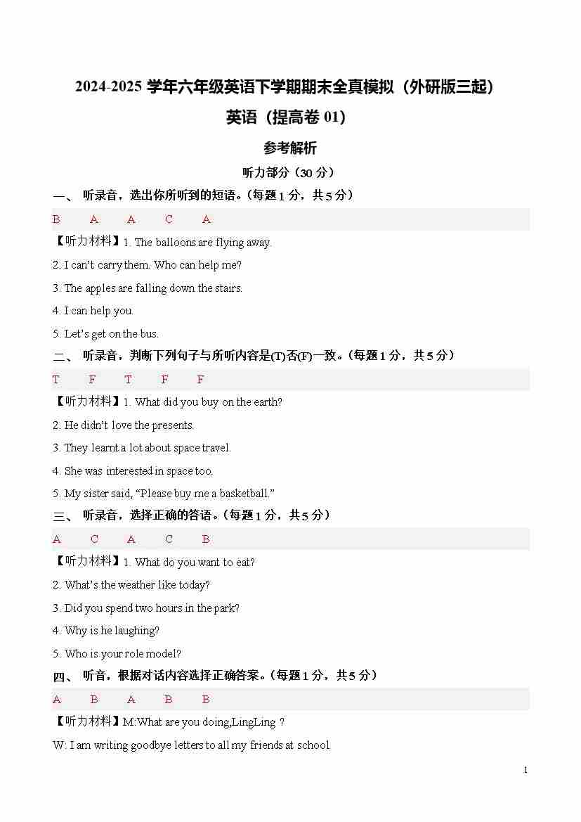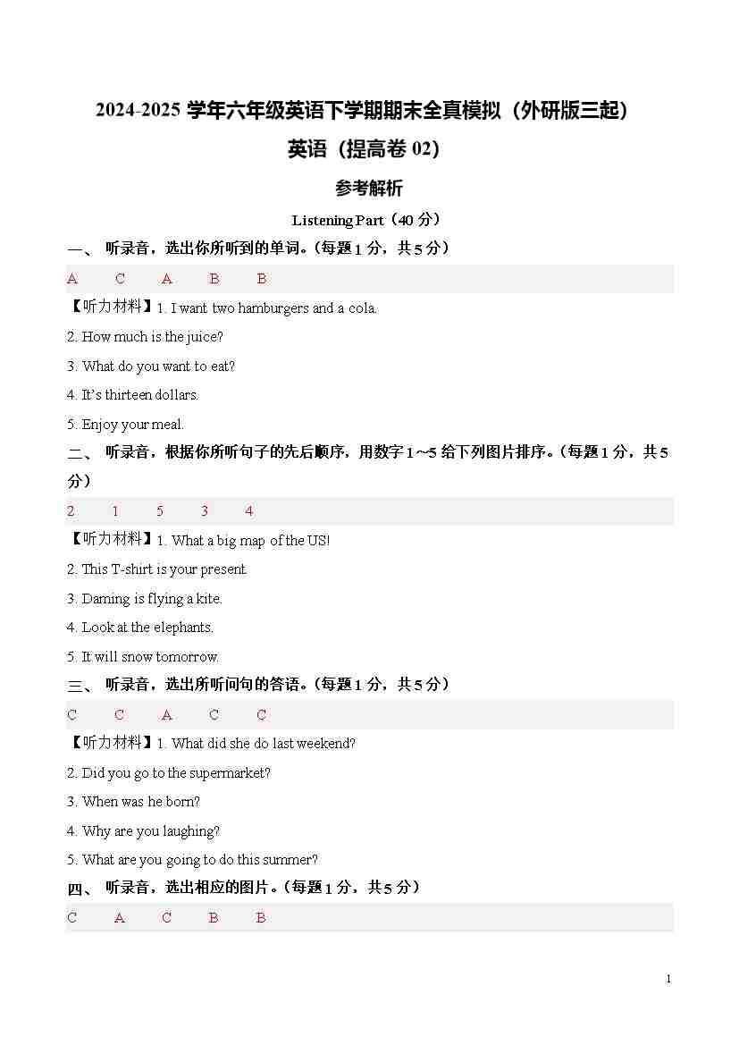 六下英语外研版三起期末模拟卷-基础卷-提高卷-听力音频
