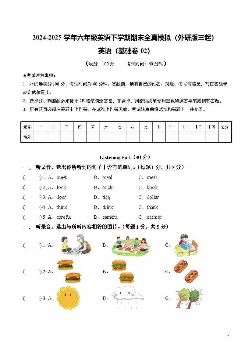 六下英语外研版三起期末模拟卷(基础卷02)(考试版A4)