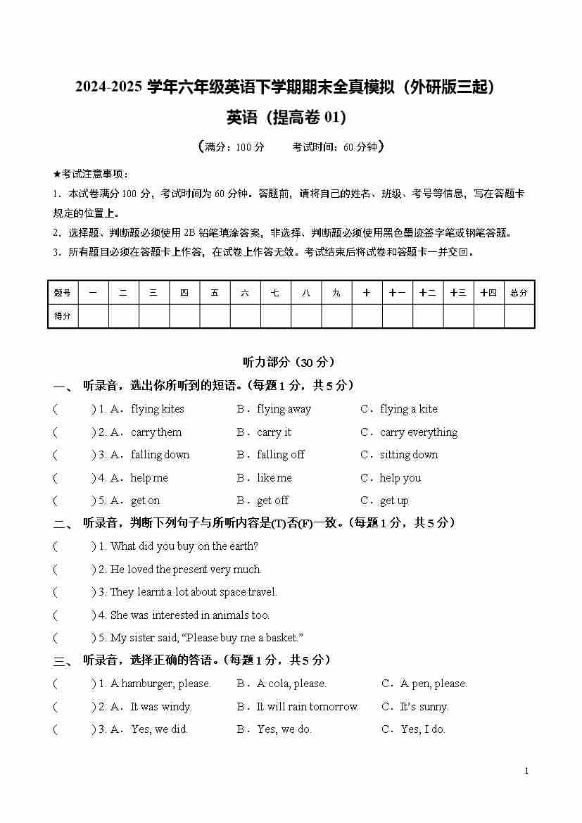 六下英语外研版三起期末模拟卷(提高卷01)(参考解析)