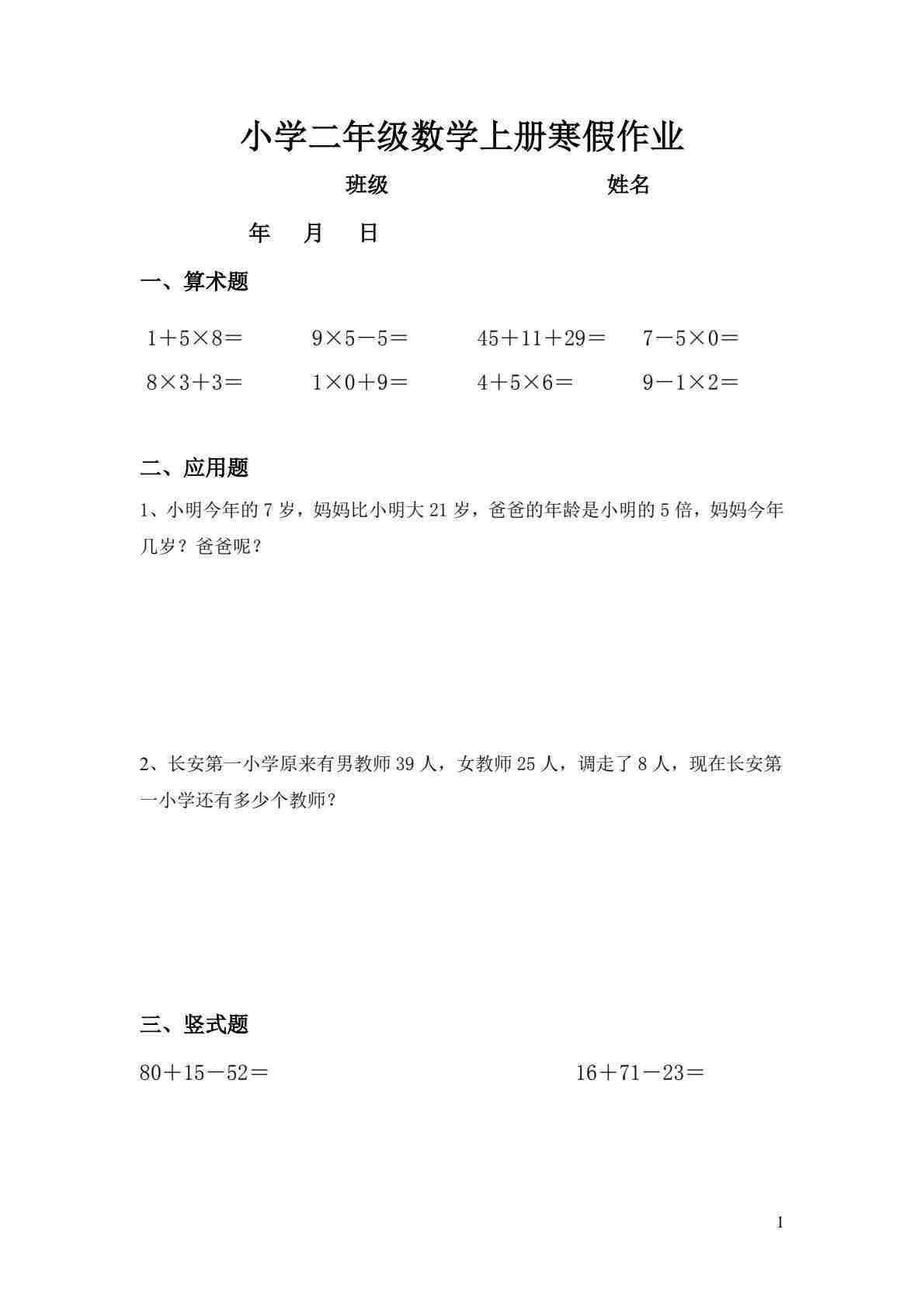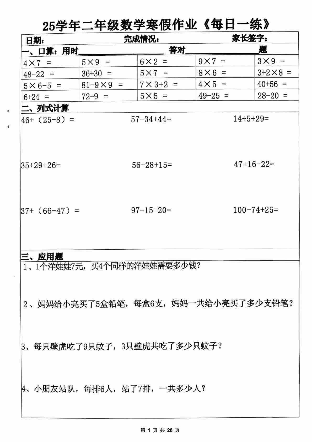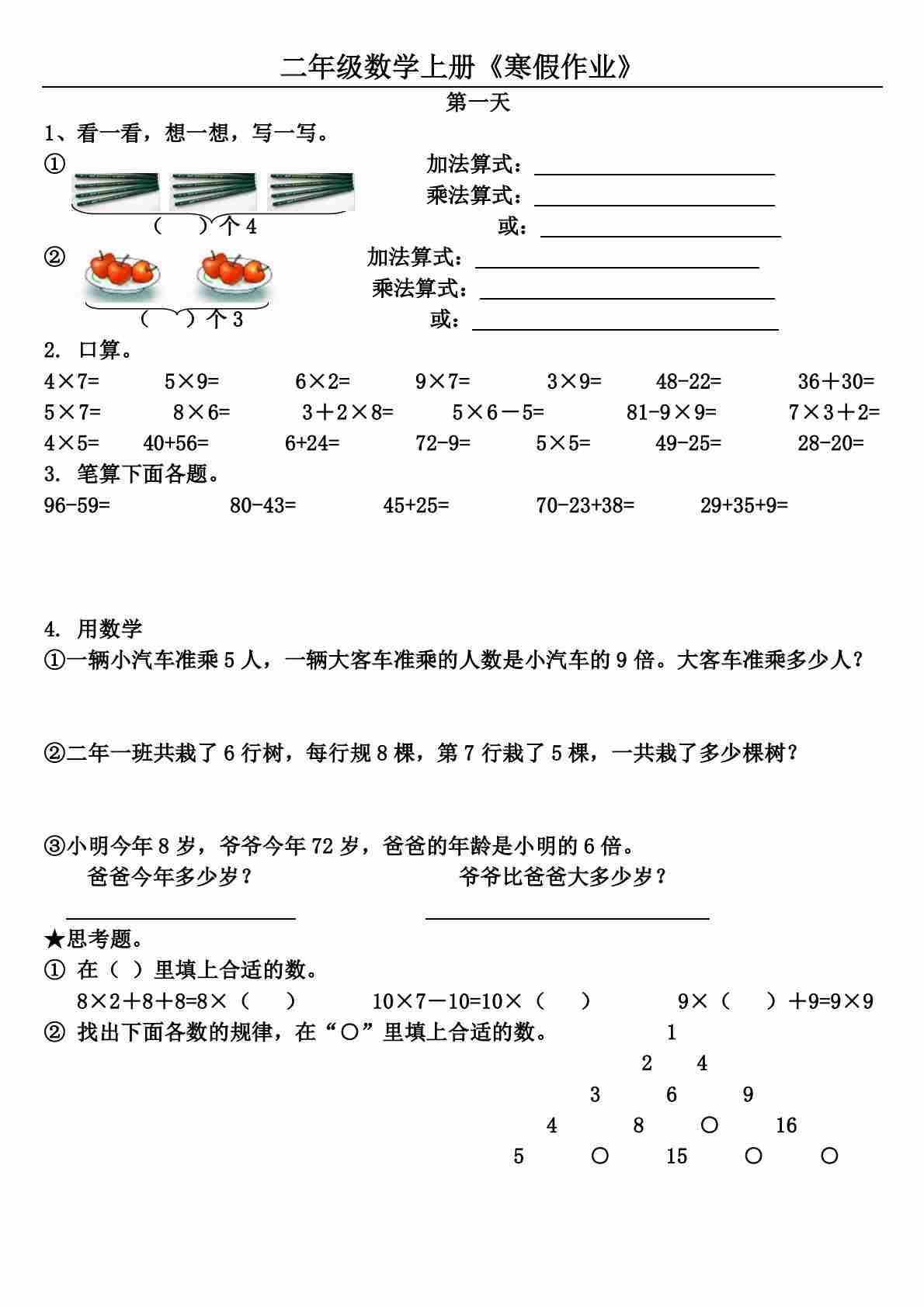 二年级数学【通用版】《寒假作业》20套全 无答案