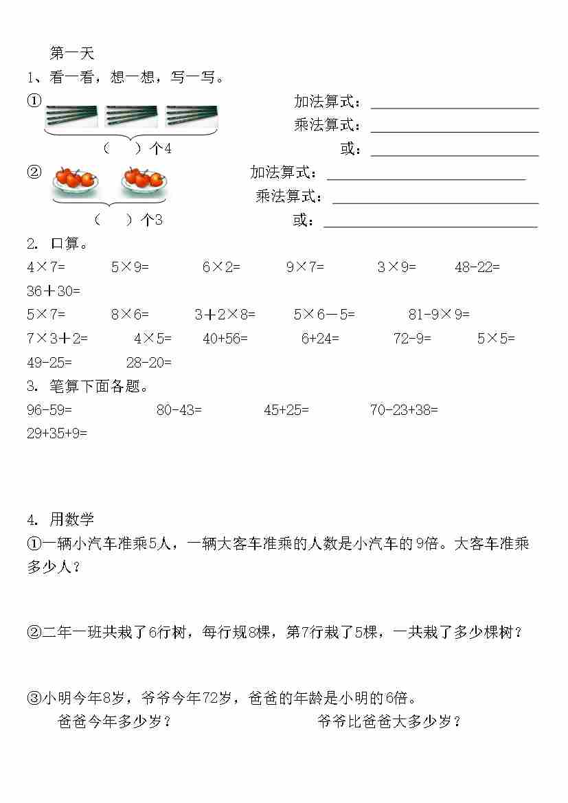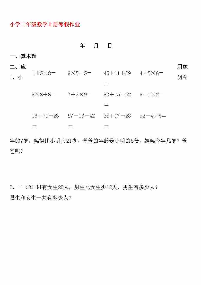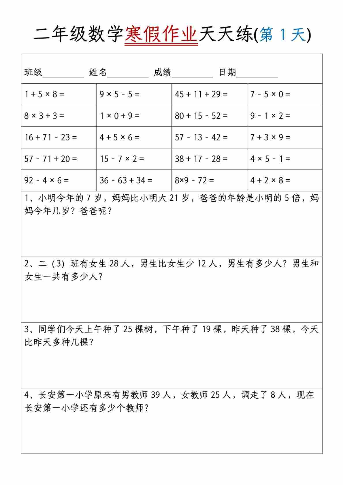二年级数学【通用版】《寒假作业》20套全 无答案