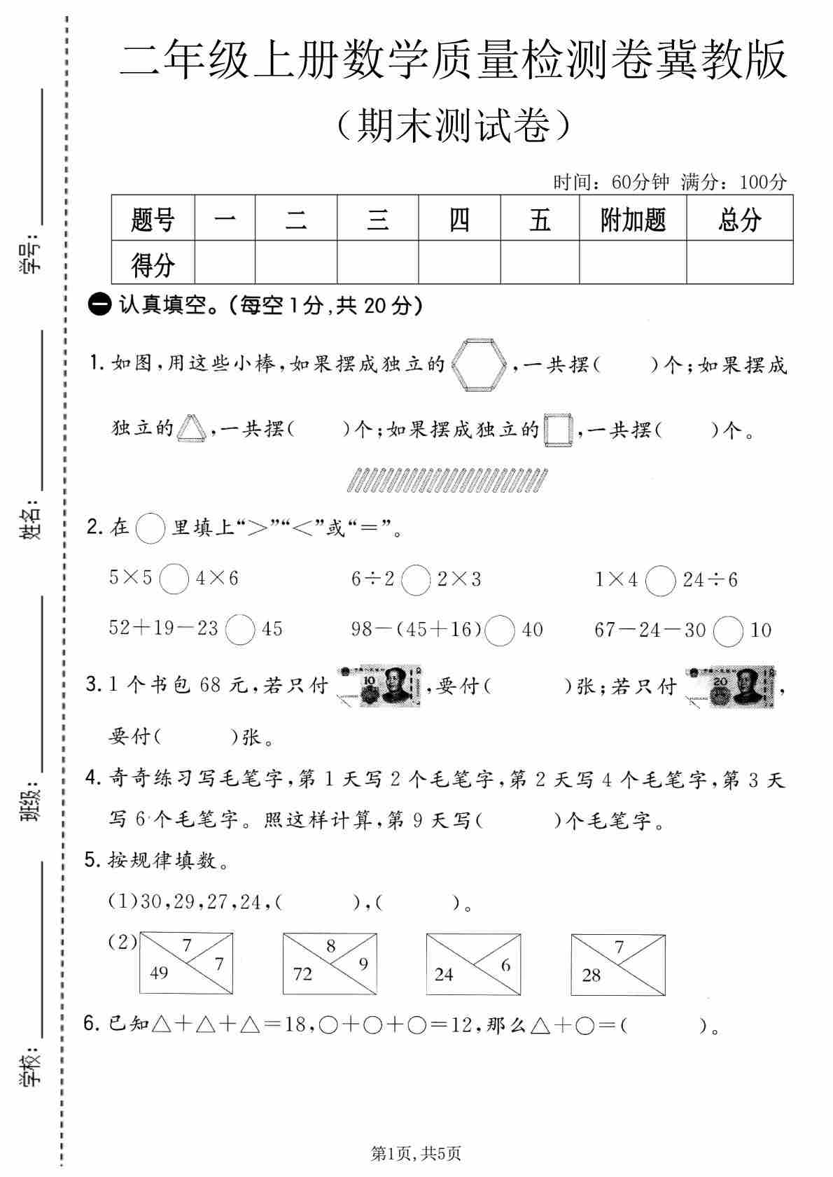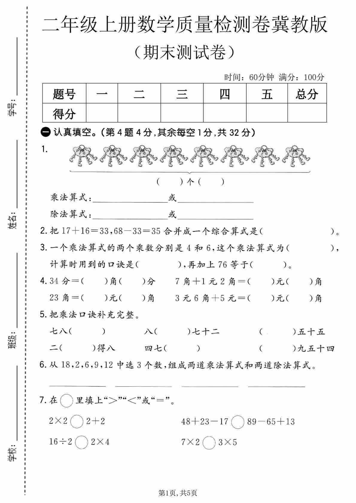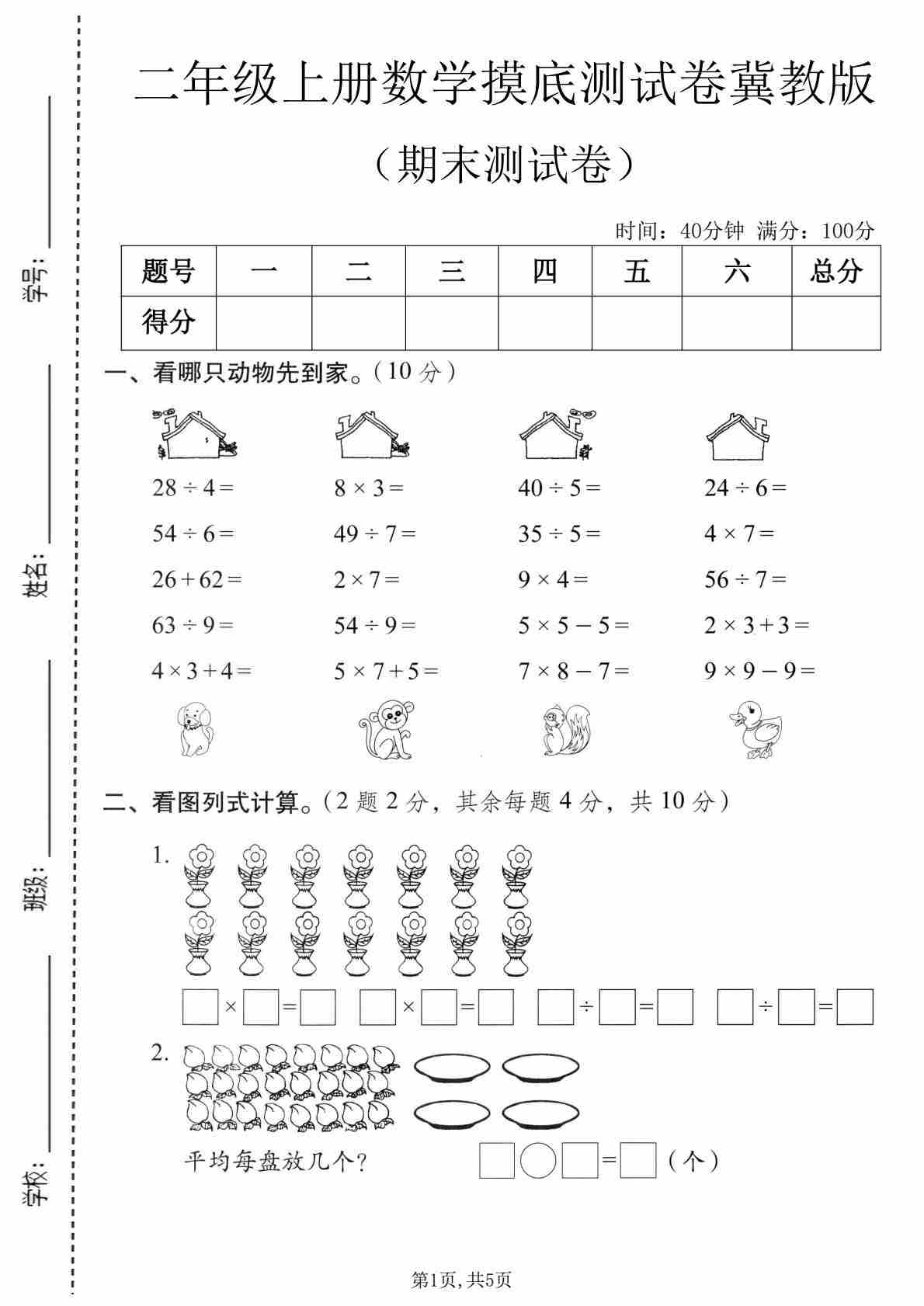 二年级(上)数学期末摸底测试卷1《冀教版》