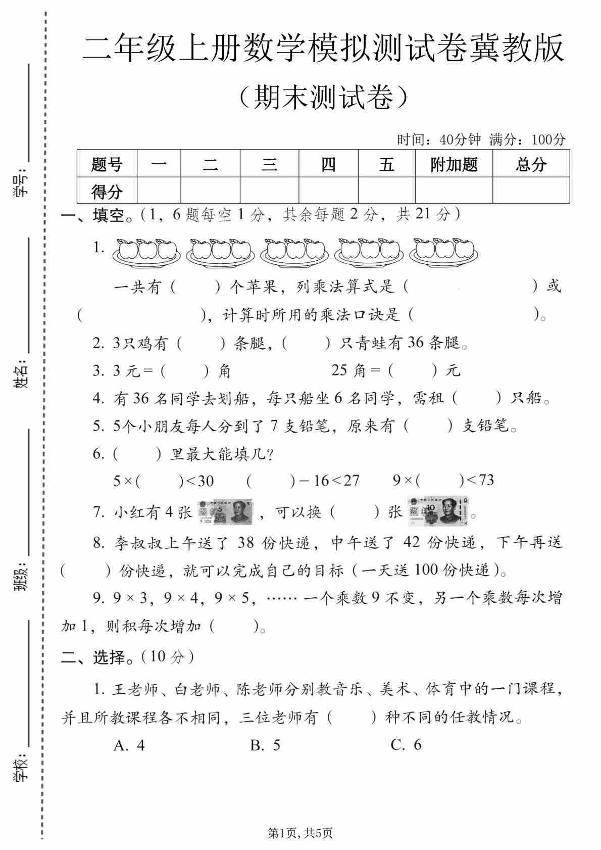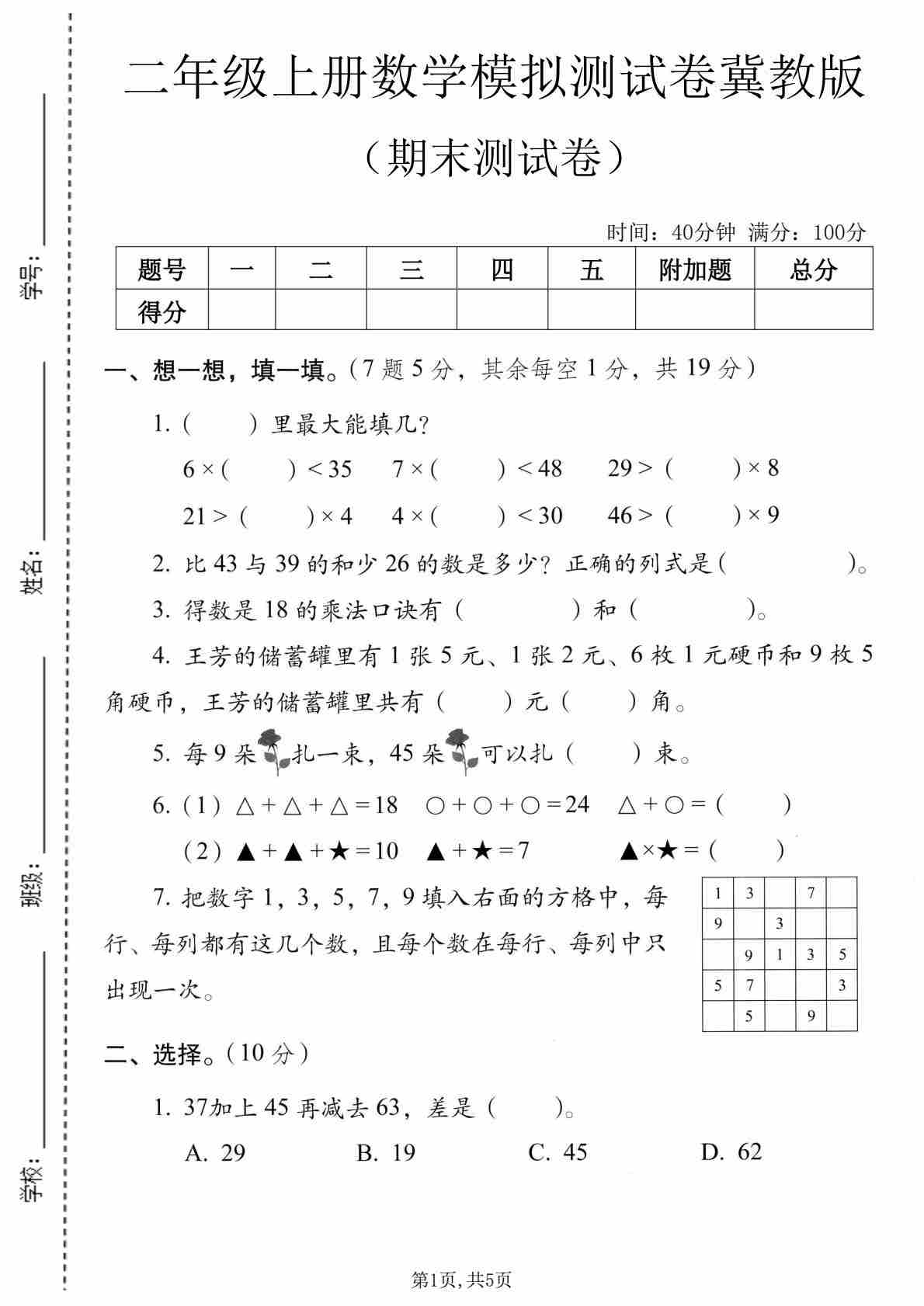 二年级(上)数学期末模拟测试卷1《冀教版》