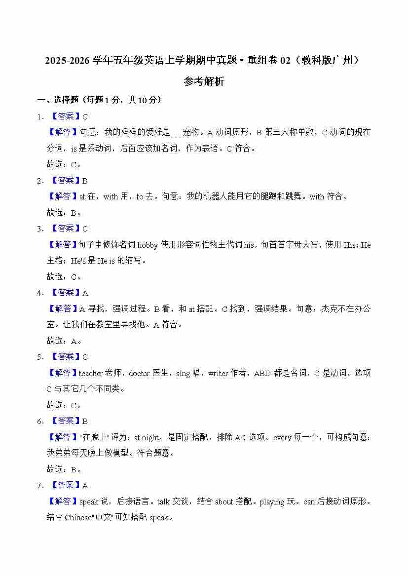 广州教科四上英语期中英语( 重组卷02)(参考解析)