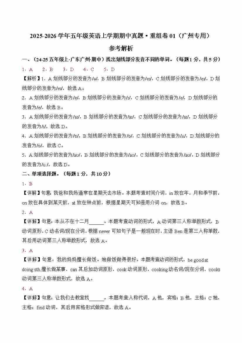 广州教科四上英语期中英语(基础卷01)(参考解析)