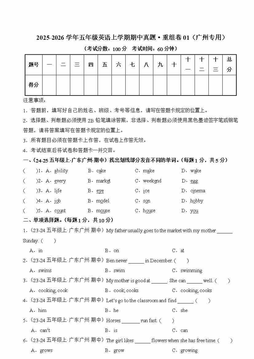 广东省广州市五年级英语上学期期末真题重组卷(教科版广州)