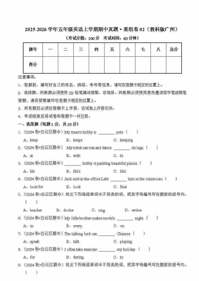 广州教科四上英语期中(重组卷02 )(考试版A4)