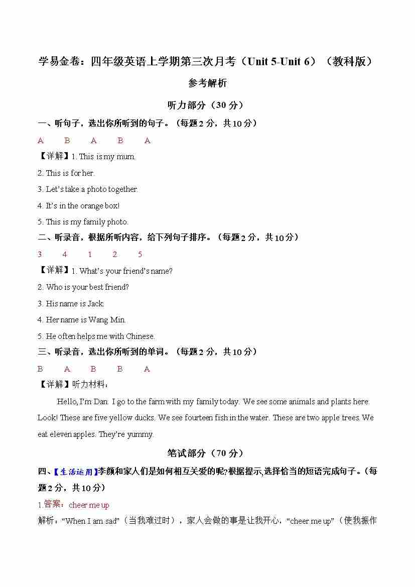 广州教科版四上第三次月考(Unit 5-Unit 6)(参考解析)
