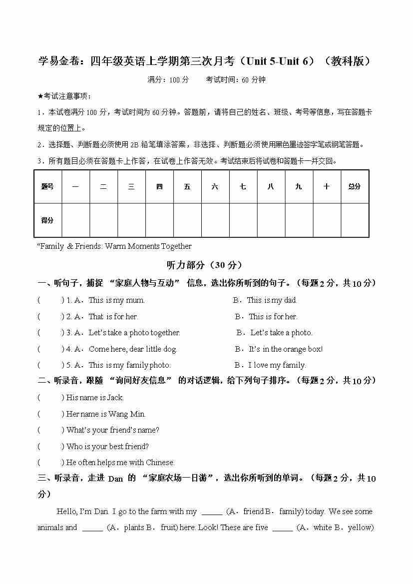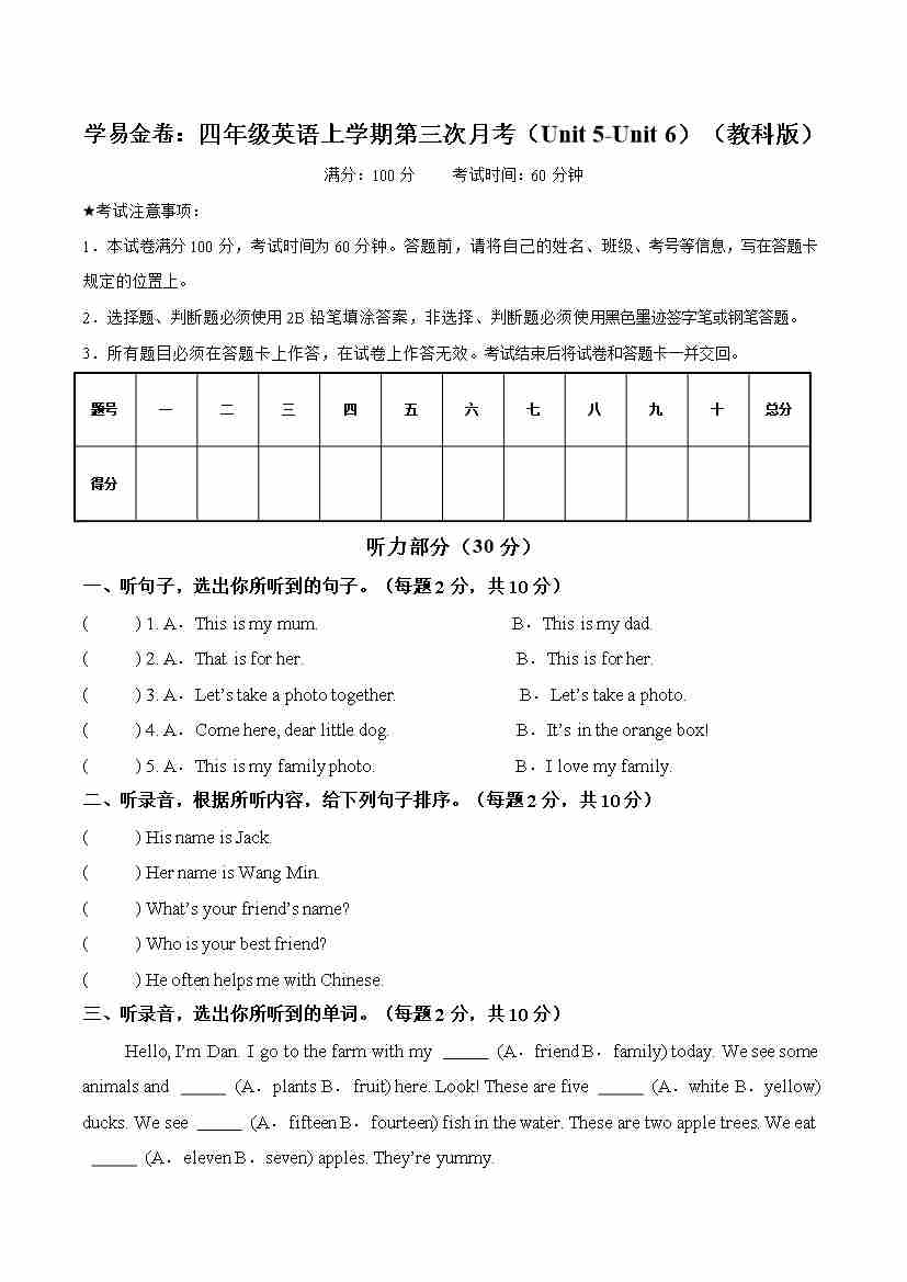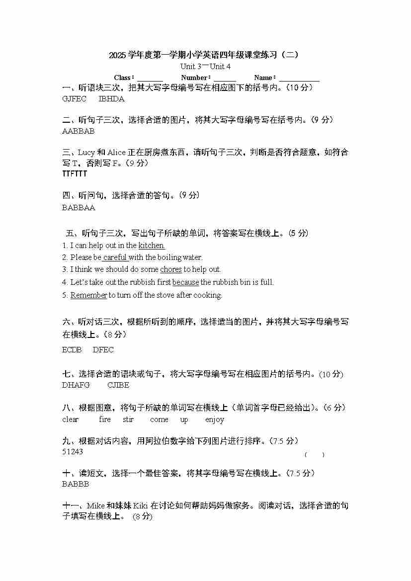 广州教科版第一学期小学英语四年级课堂练习月考(听力音频)