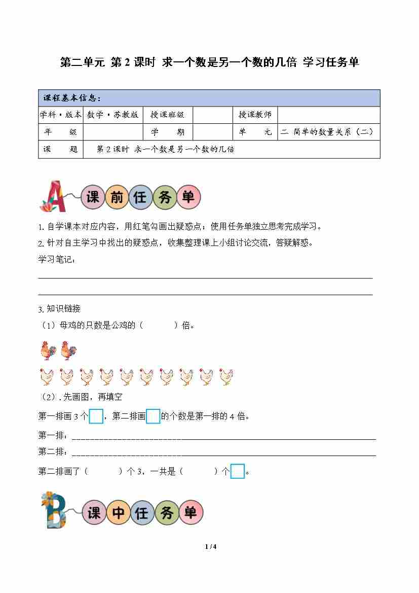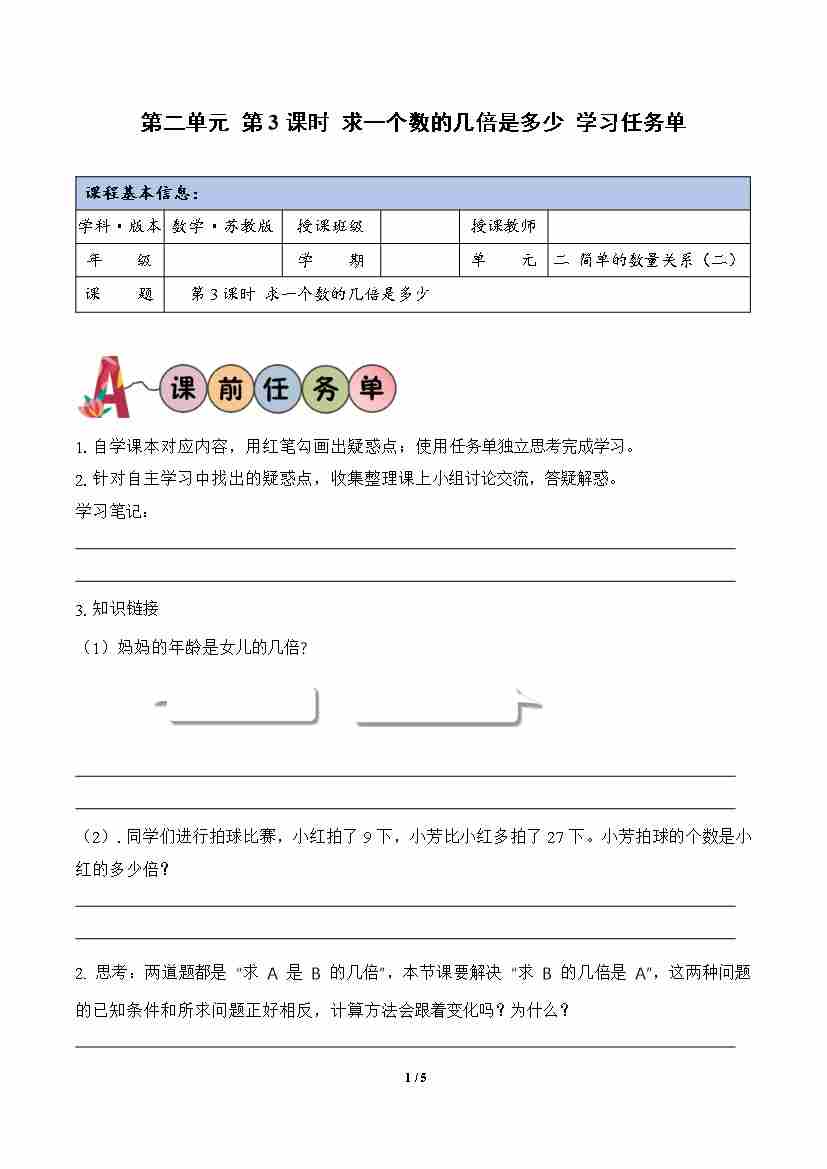 第2单元 第2课时 求一个数是另一个数的几倍(学习任务单)苏教版数学二年级下册(新教材)