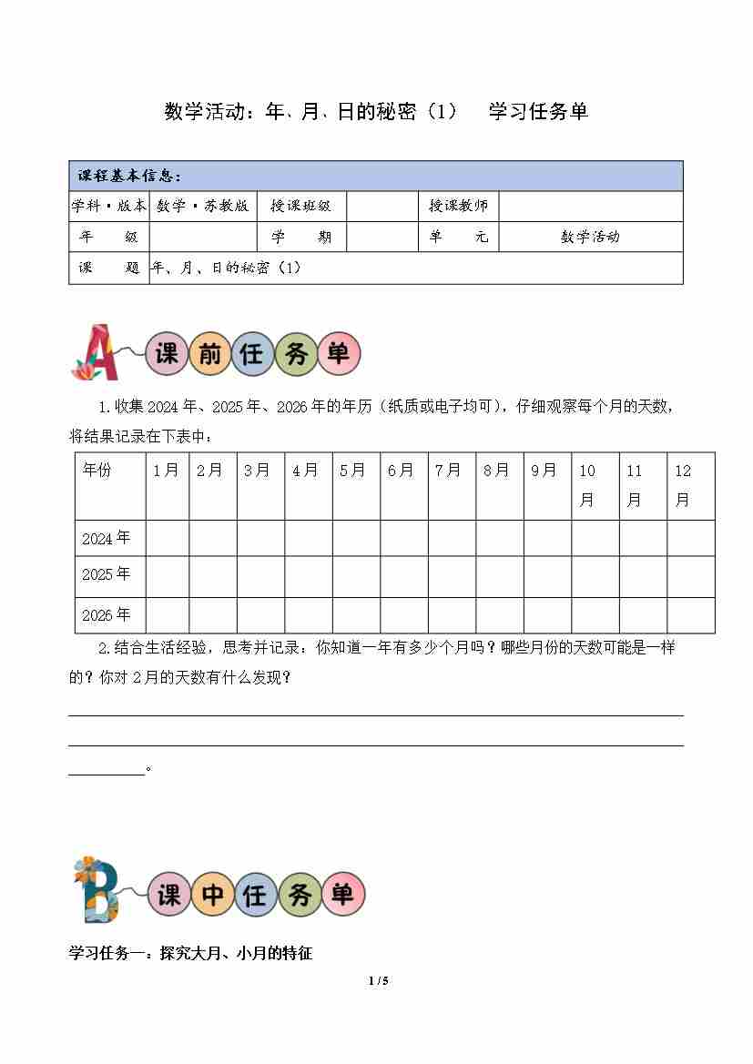 数学活动:年、月、日的秘密(1)(学习任务单) 数学苏教版三年级下册(新教材)
