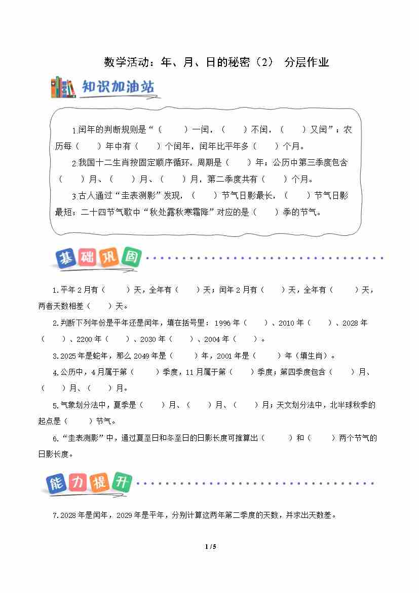 数学活动:年、月、日的秘密(2)(分层作业) 数学苏教版三年级下册(新教材)
