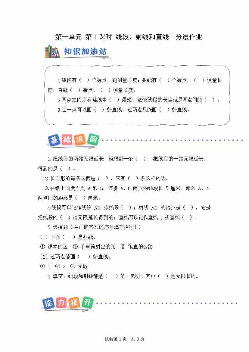 第1单元第1课时 线段、射线和直线(分层作业) 数学苏教版三年级下册(新教材)