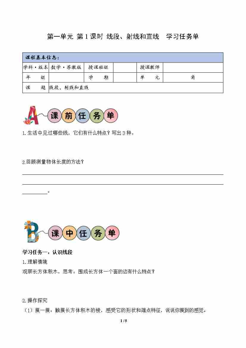 第1单元第1课时 线段、射线和直线(学习任务单) 数学苏教版三年级下册(新教材)