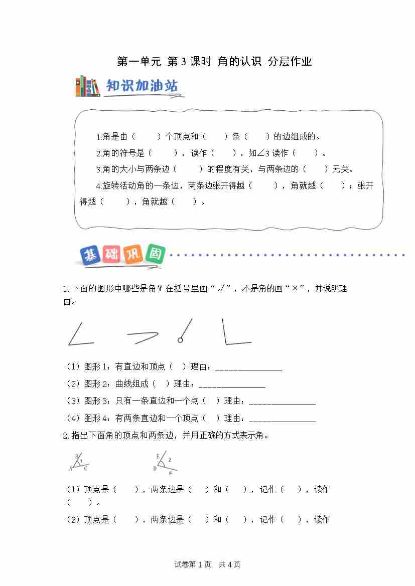 第1单元第3课时 角的认识(分层作业) 数学苏教版三年级下册(新教材)