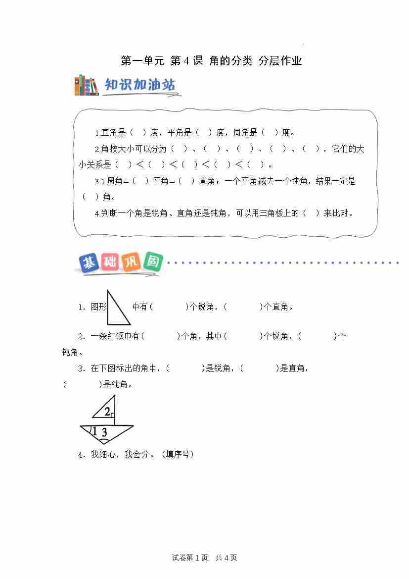 第1单元第4课时 角的分类(分层作业) 数学苏教版三年级下册(新教材)