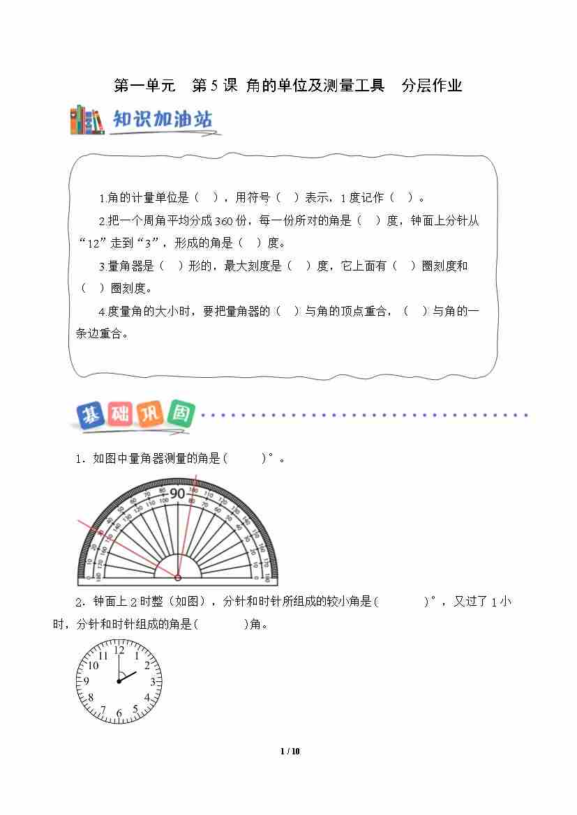 第1单元第5课时 角的单位及测量工具(分层作业) 数学苏教版三年级下册(新教材)