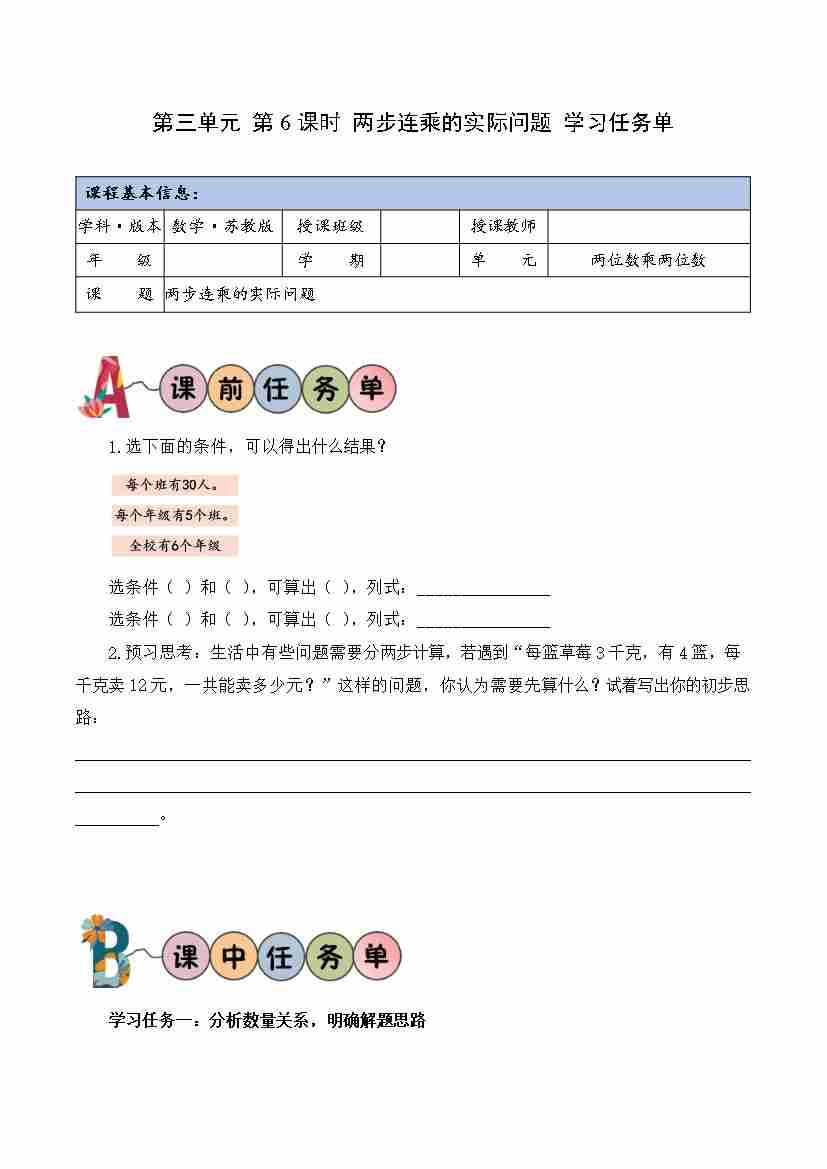 第3单元 第6课时 两步连乘的实际问题 (学习任务单)