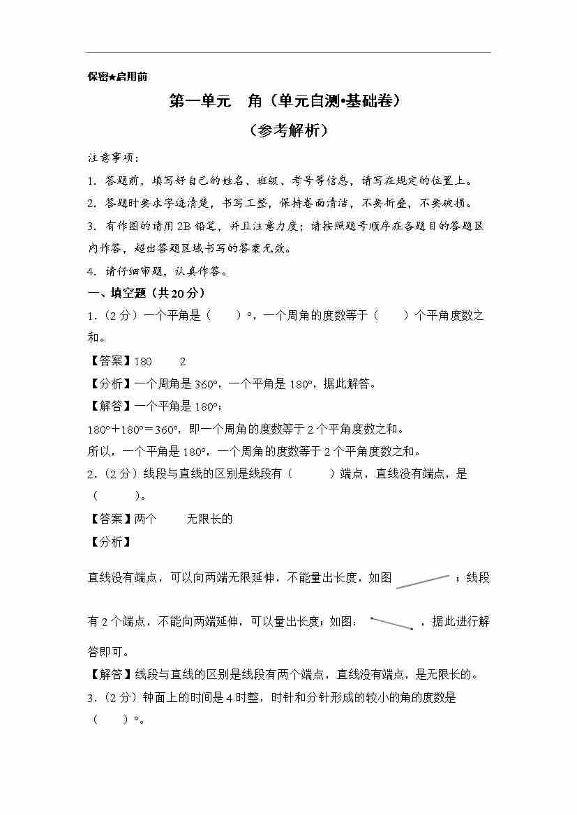 第一单元 角(单元自测基础卷)数学苏教版三年级下册(参考解析)