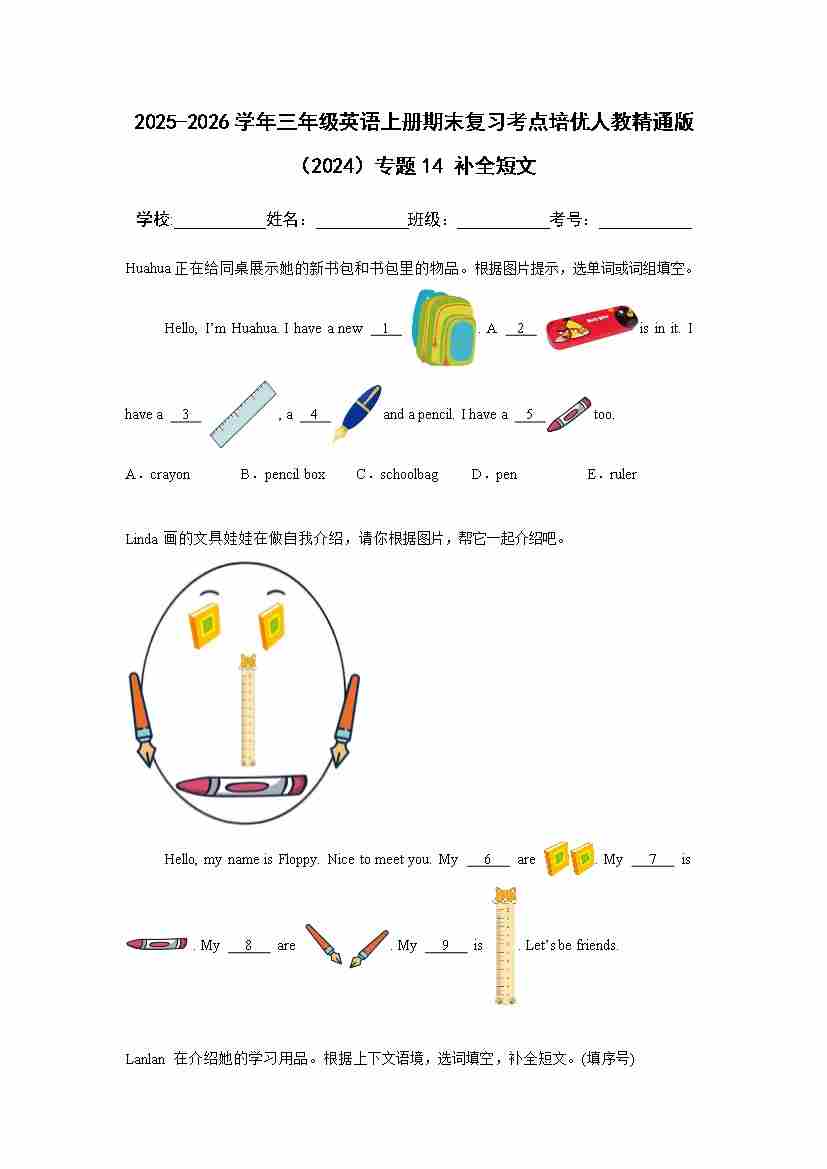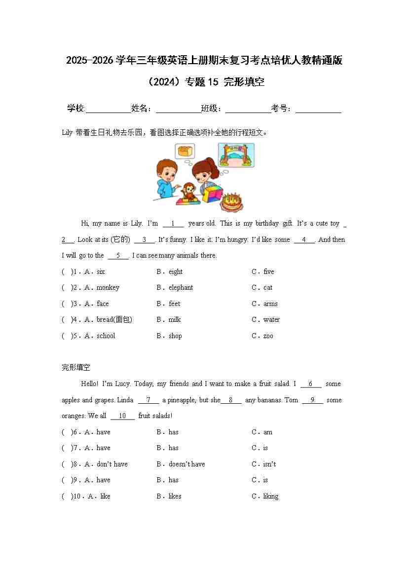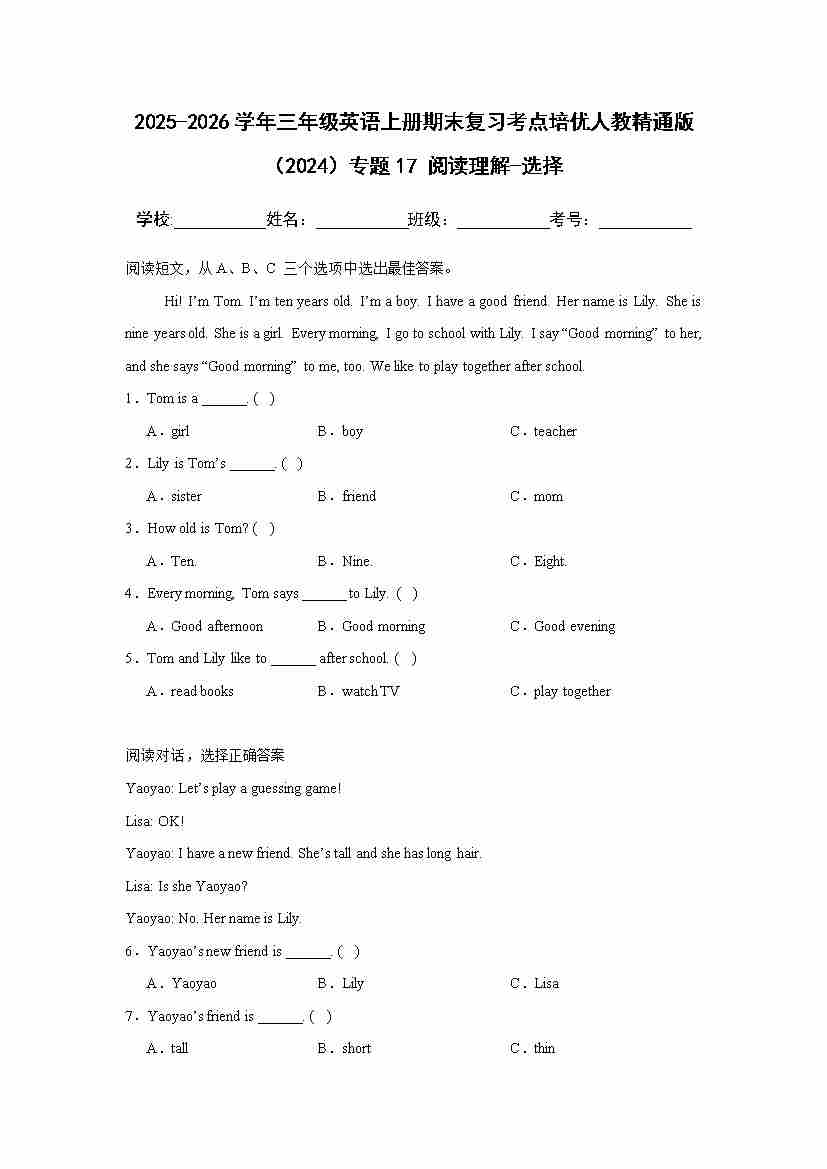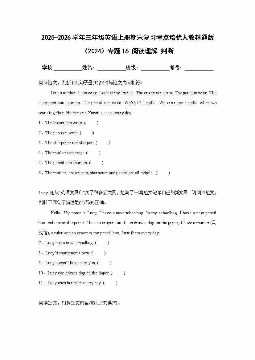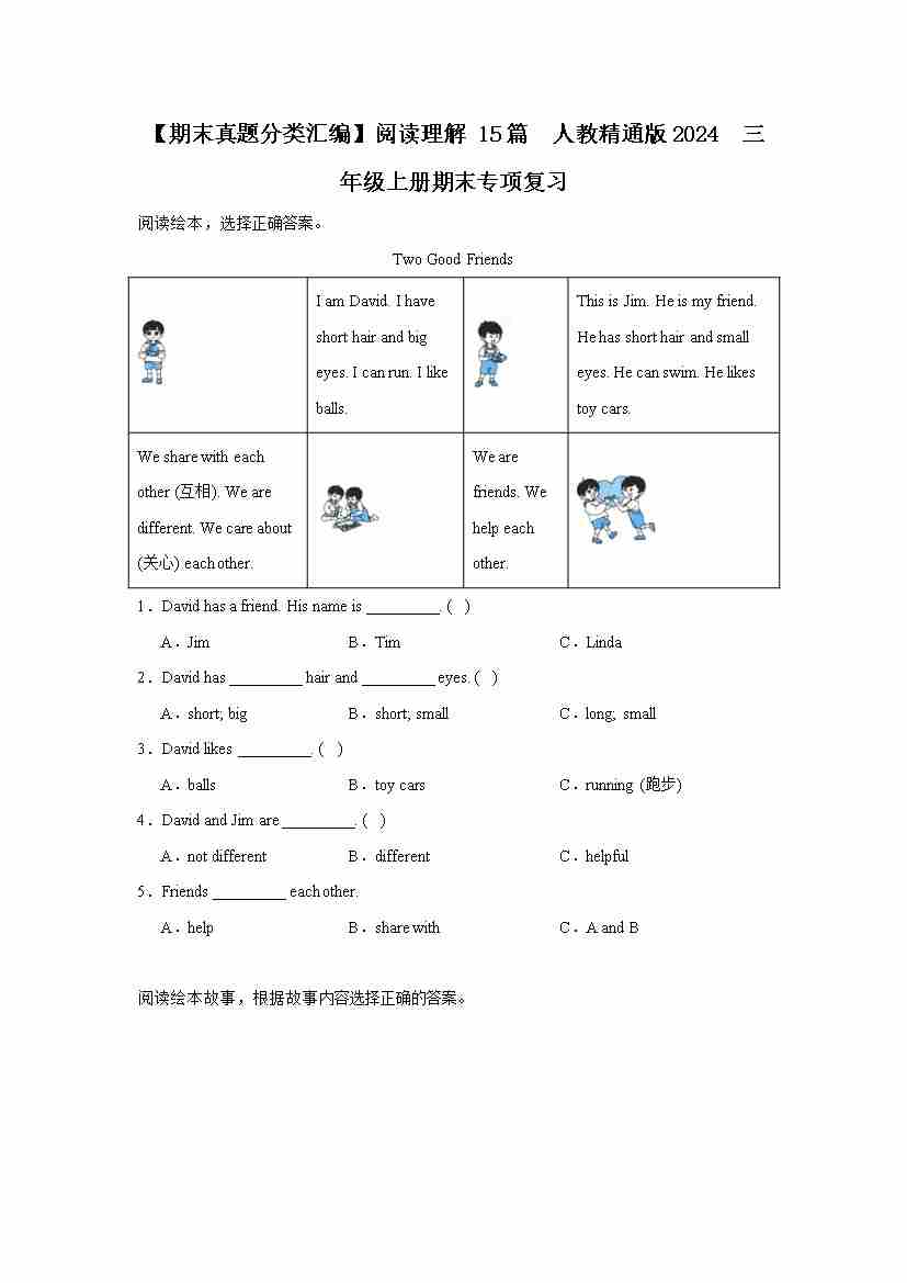【期末真题】阅读理解15篇人教精通版三年级上册期末专项复习(含答案)