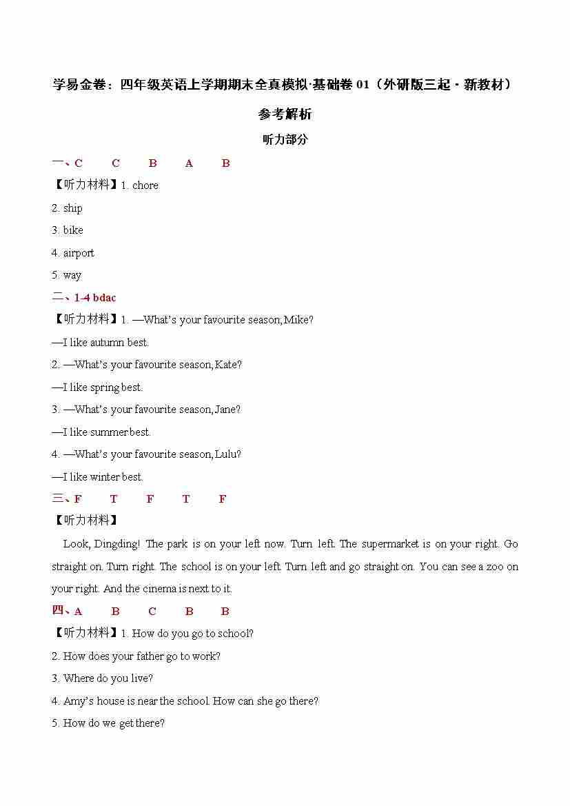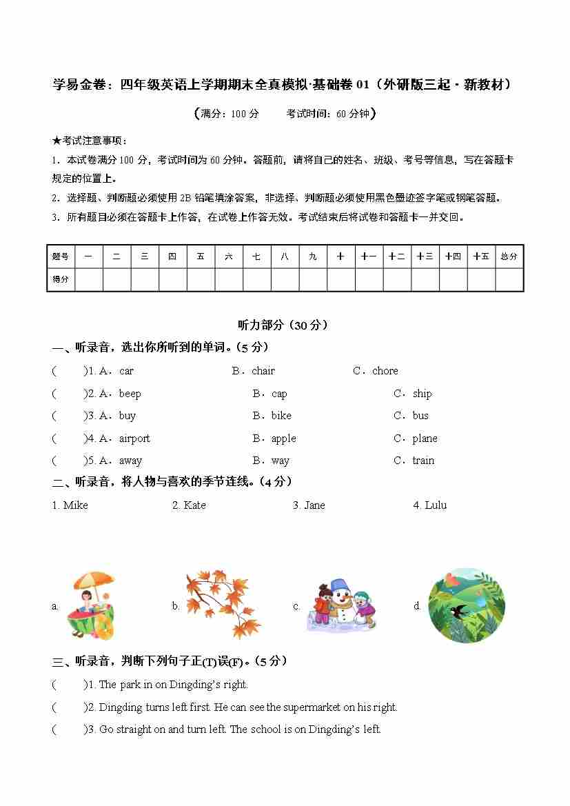25新四上英语外研版期末试卷(基础卷01)(参考解析)