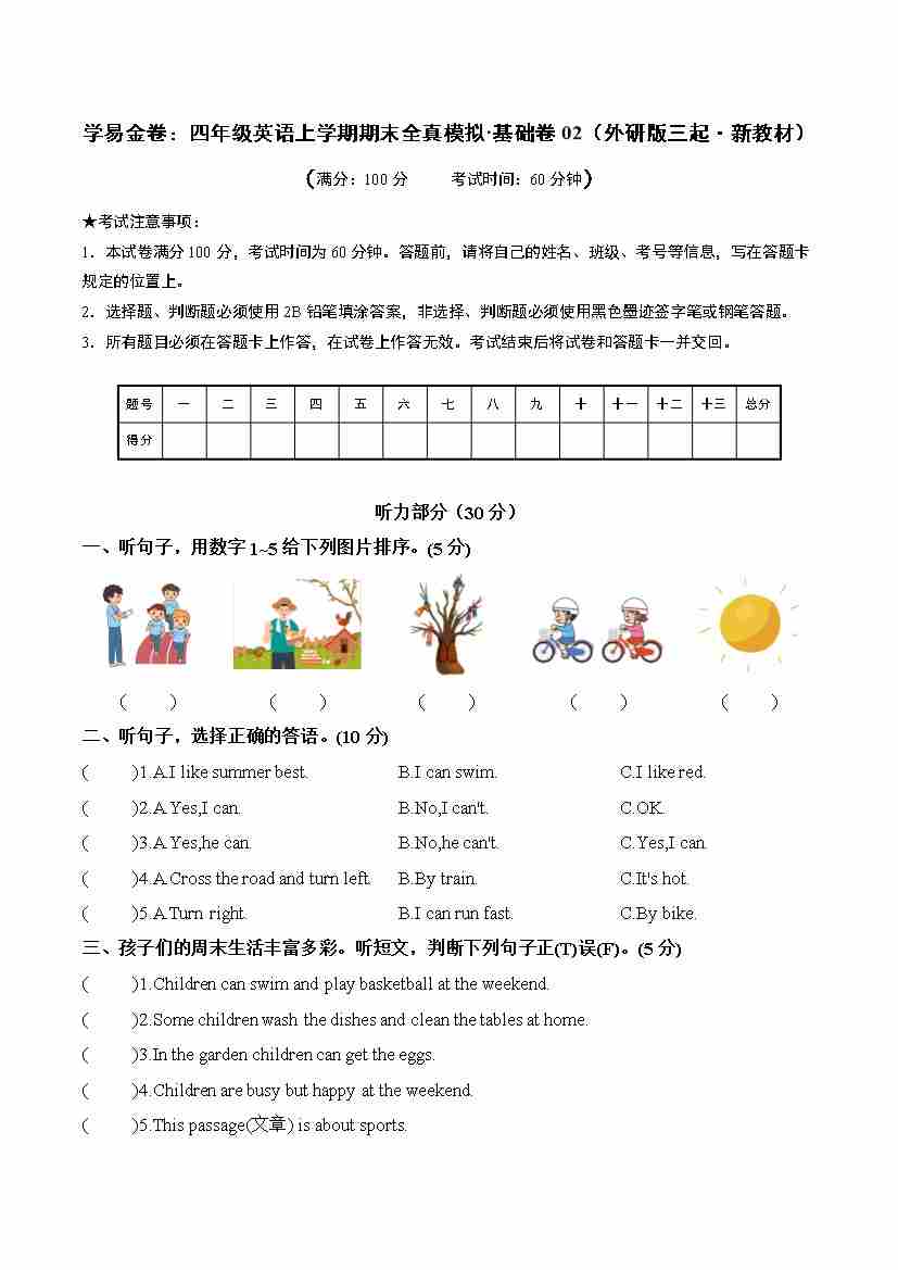 25新四上英语外研版期末试卷(基础卷02)(参考解析)