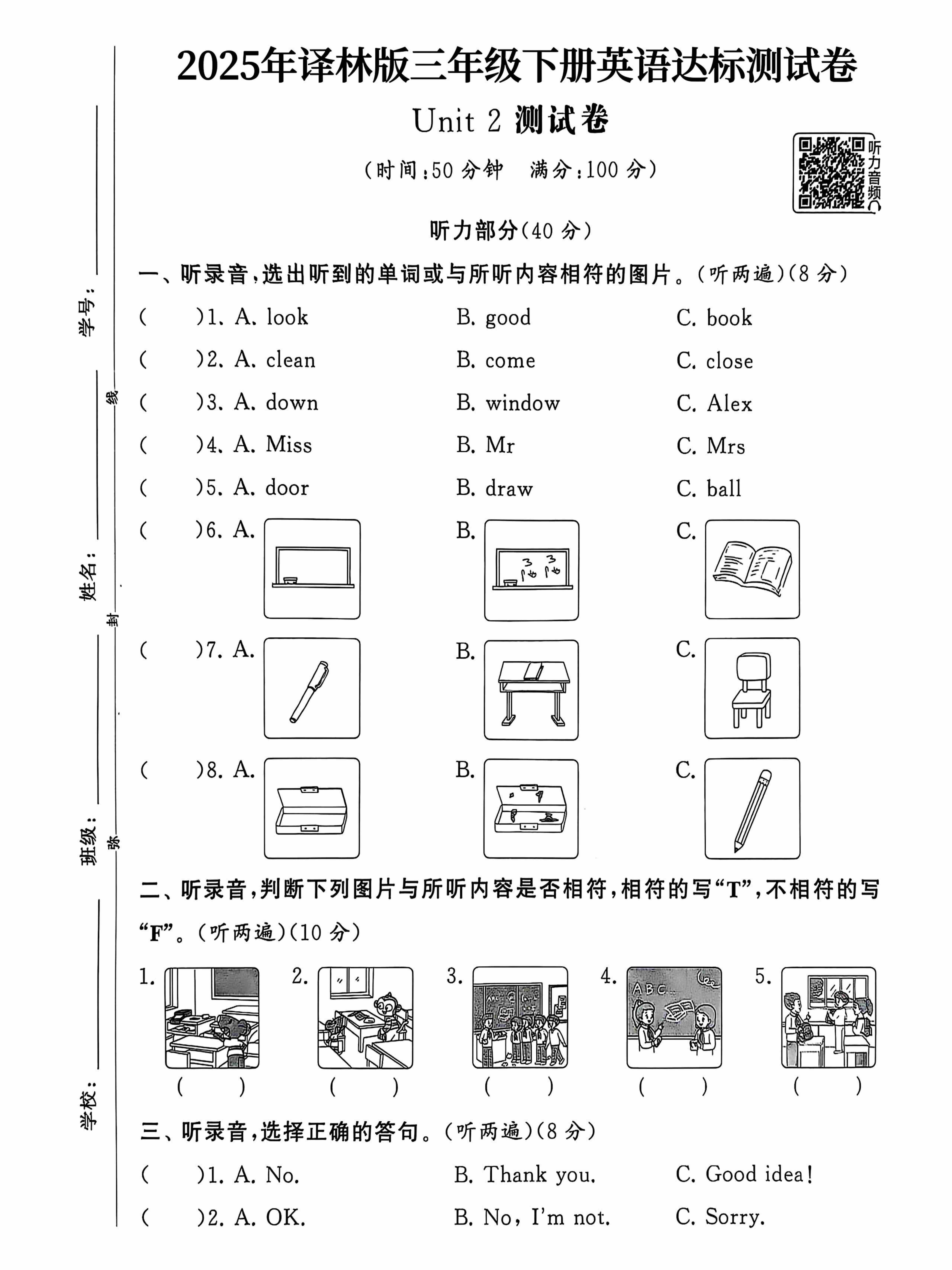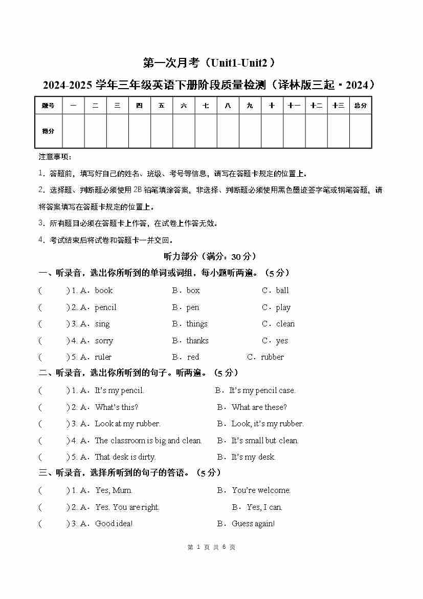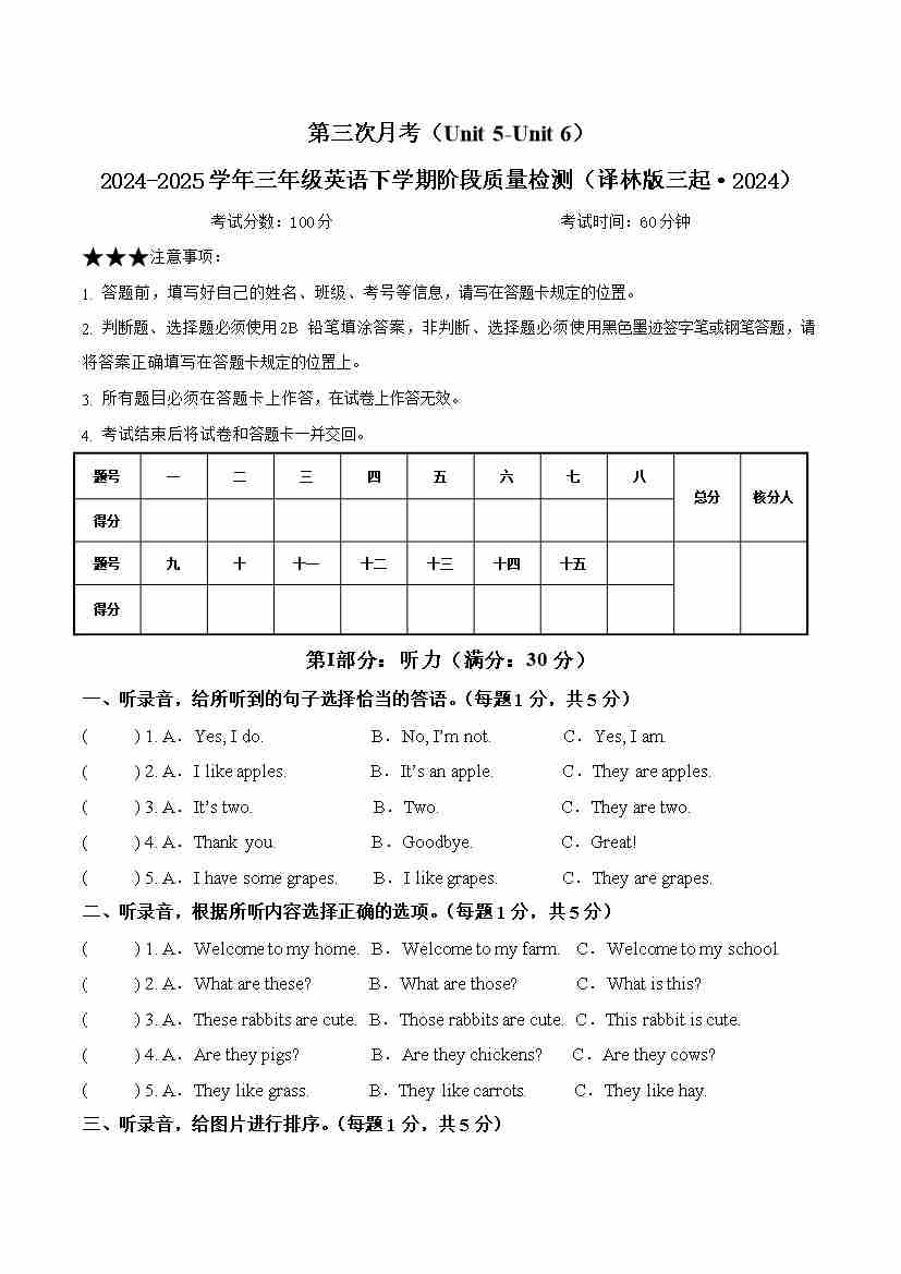 三(下)英语译林版月考试卷听力音频