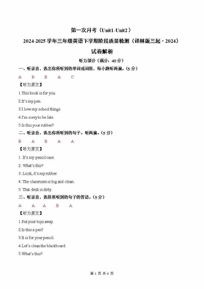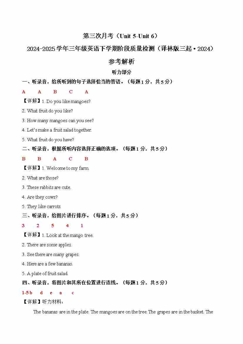 2024-2025学年英语三年级下册单元速记·巧练系列(译林版三起)单元测试听力音频