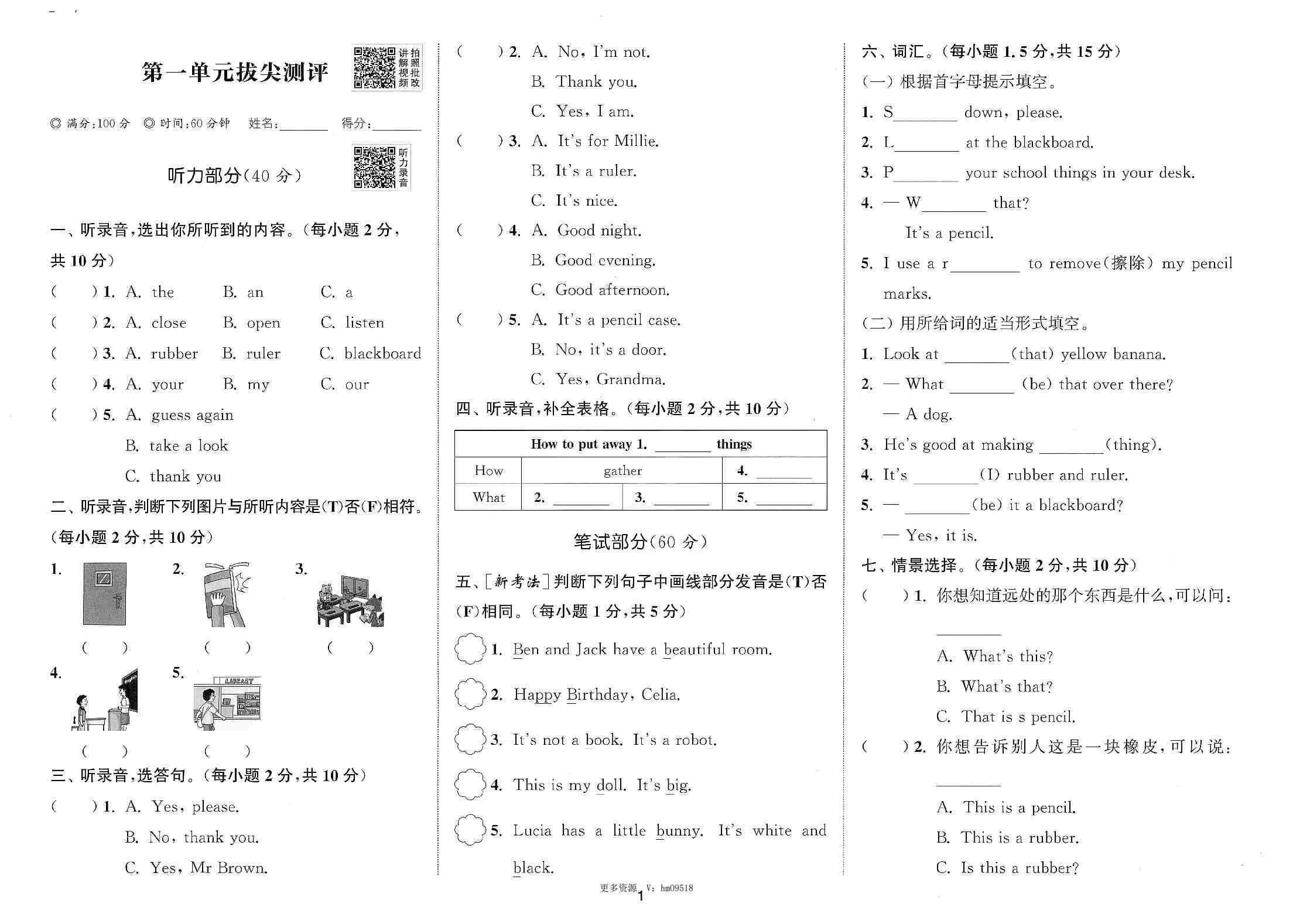 三(下)译林版英语第1单元测试卷