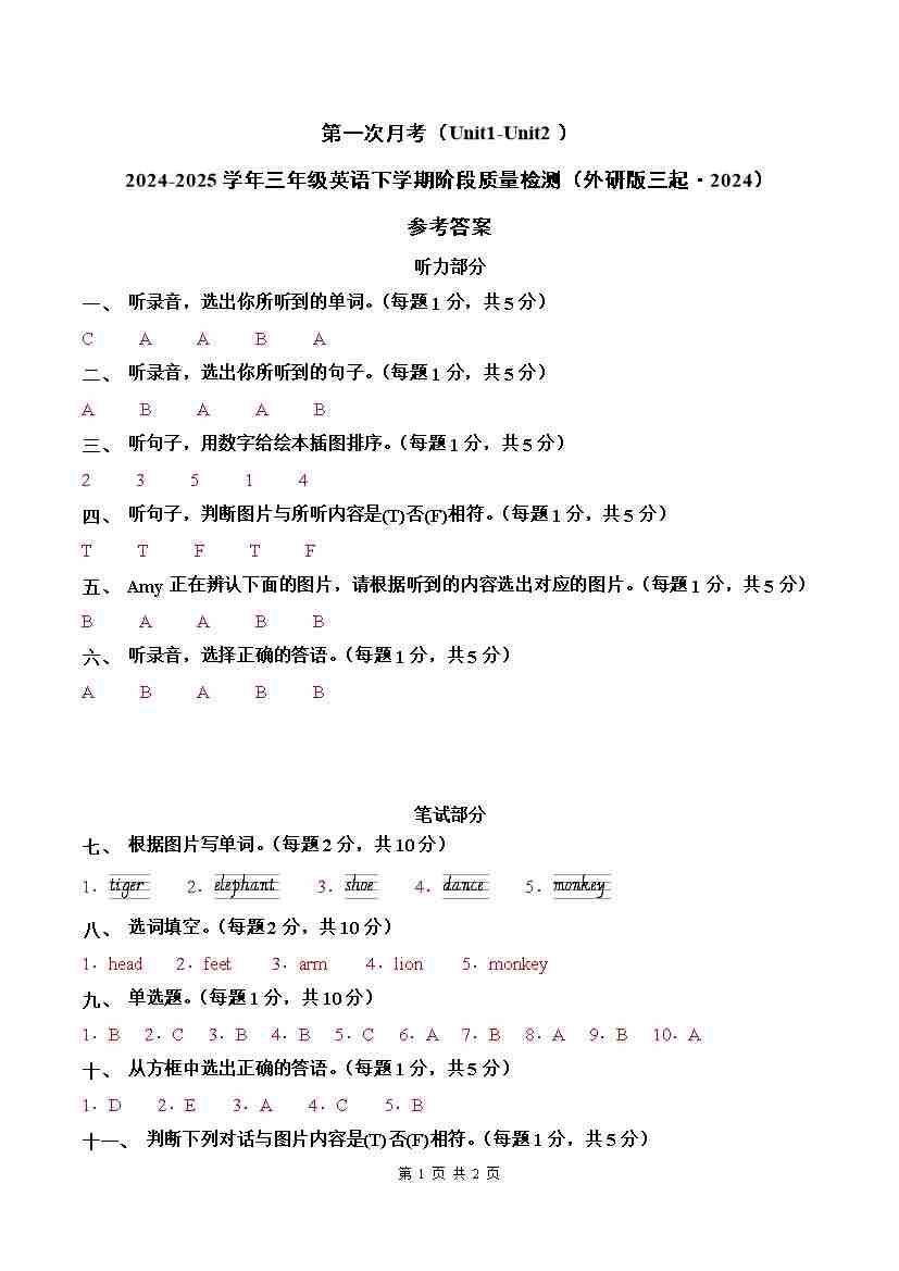 三下英语外研版三起第一次月考卷(Unit1-Unit2)(参考答案)