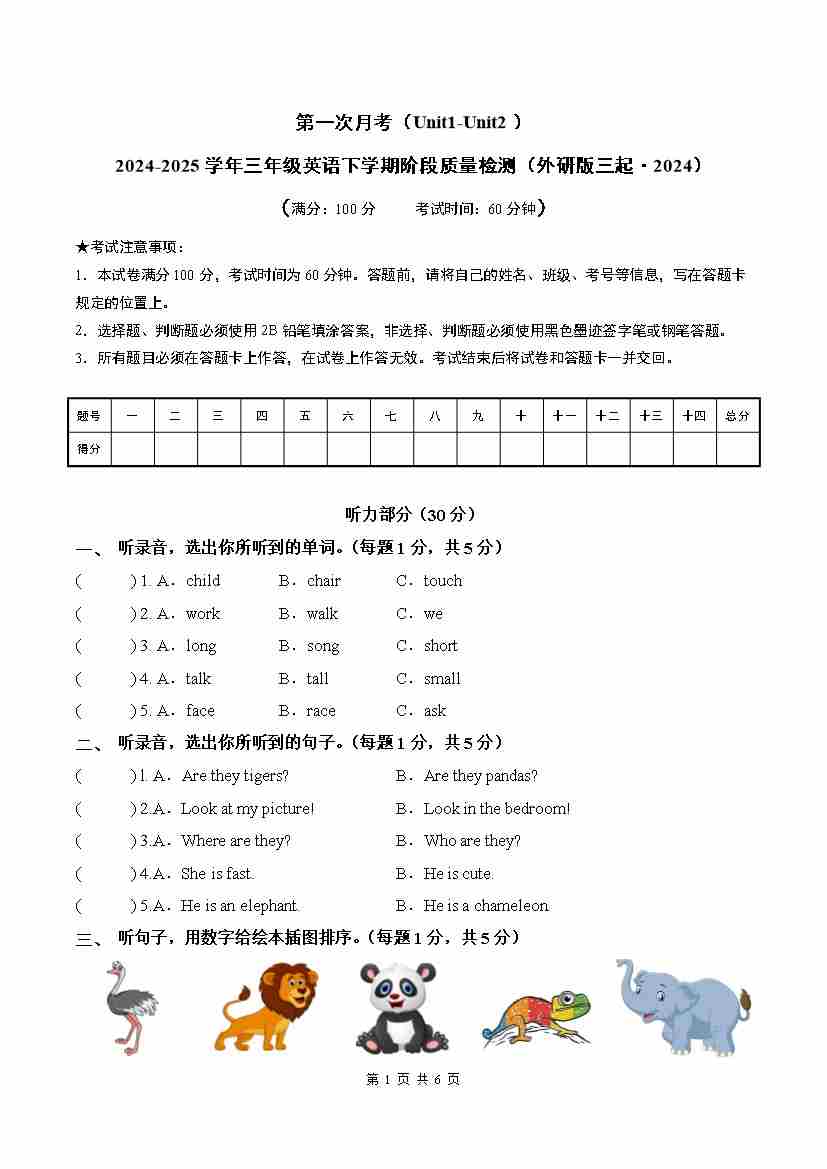 三下英语外研版三起第一次月考卷听力音频