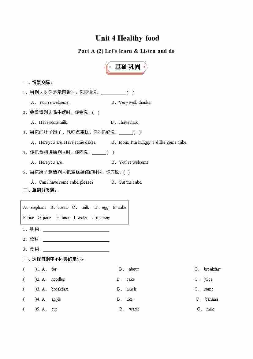 三下英语-Unit4(第2课时)Healthy food . PartA Let's learn&Listen and do 同步分层作业(人教PEP版)