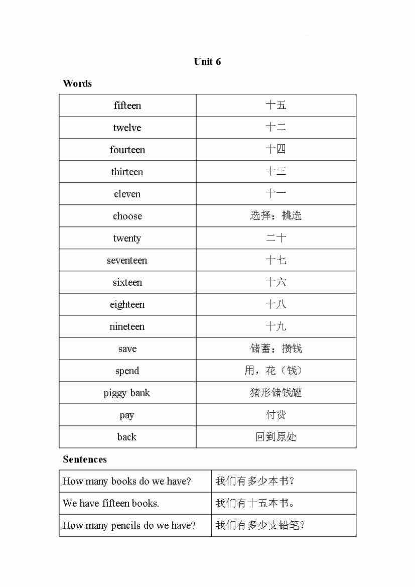 Unit 6 Numbers in life(知识清单)