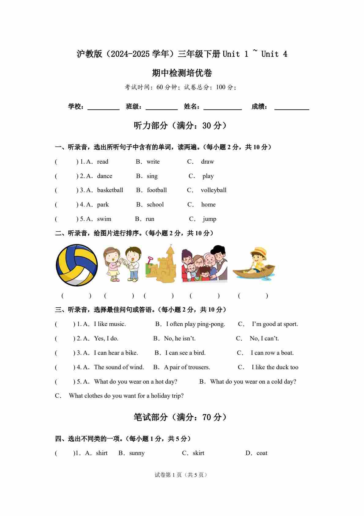 Unit 1~Unit 4 沪教版三下英语期中检测培优卷(原卷版)