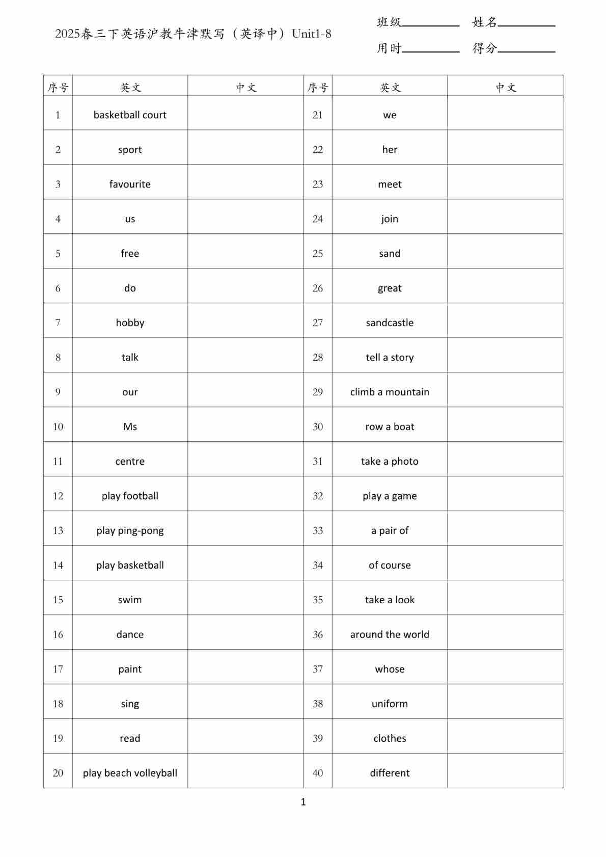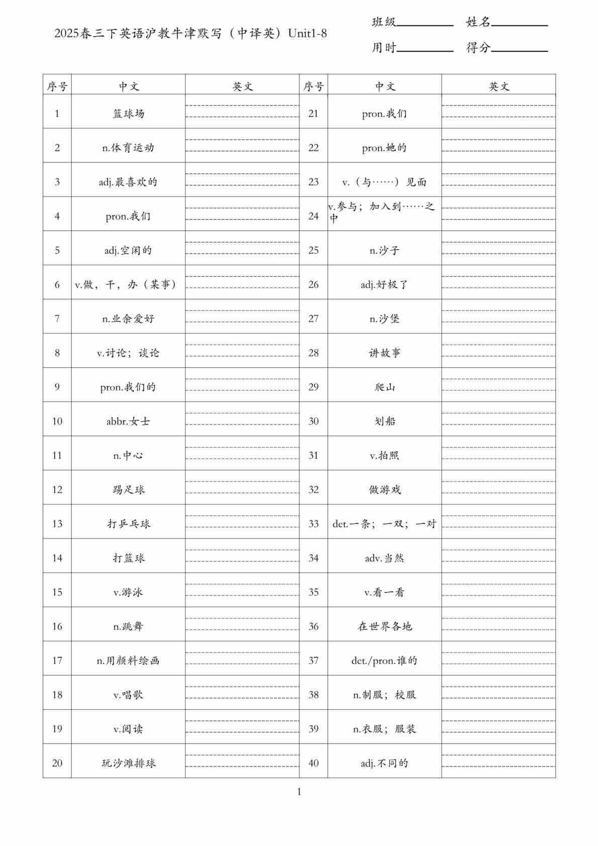 三(下)英语沪教牛津默写(中译英)Unit1-8