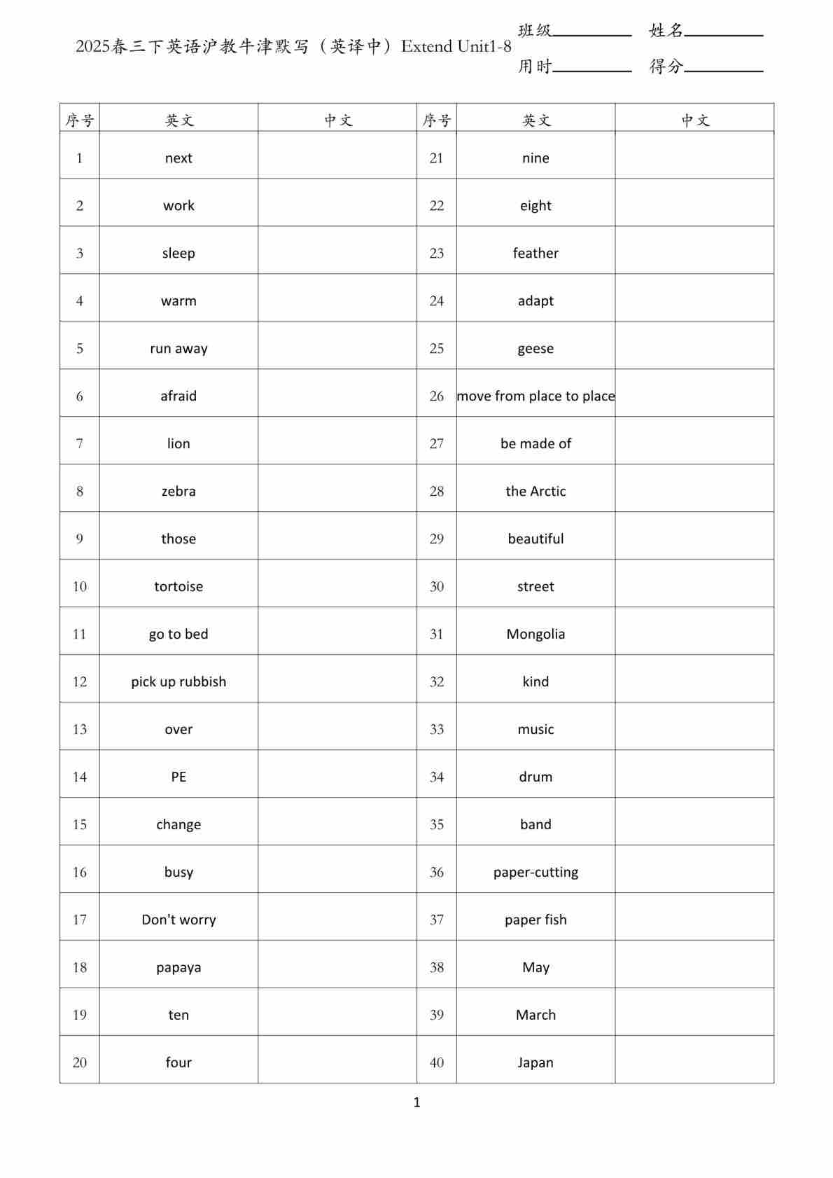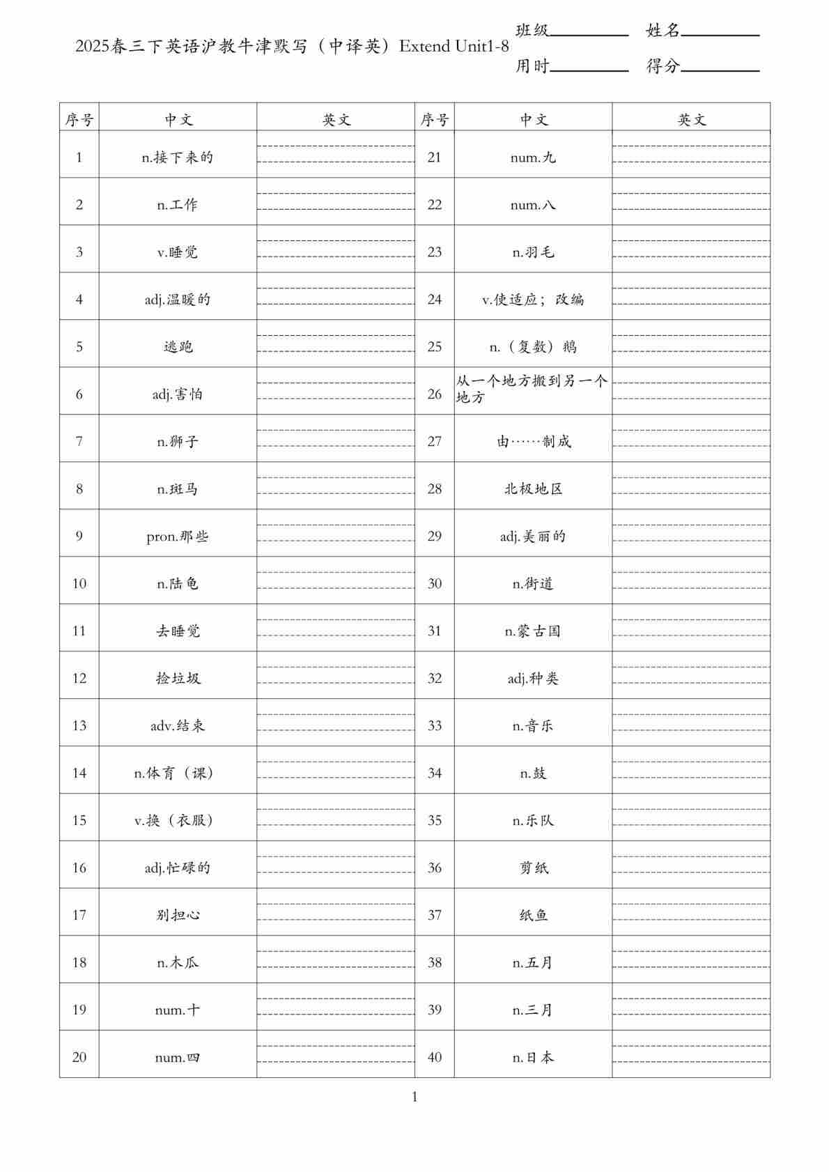 三(下)英语牛津沪教默写(英译中)Extend Unit1-8