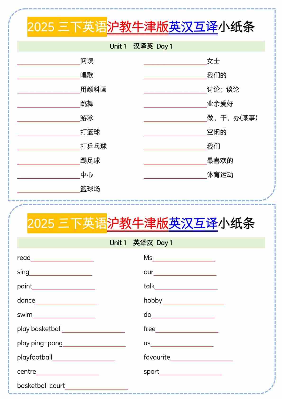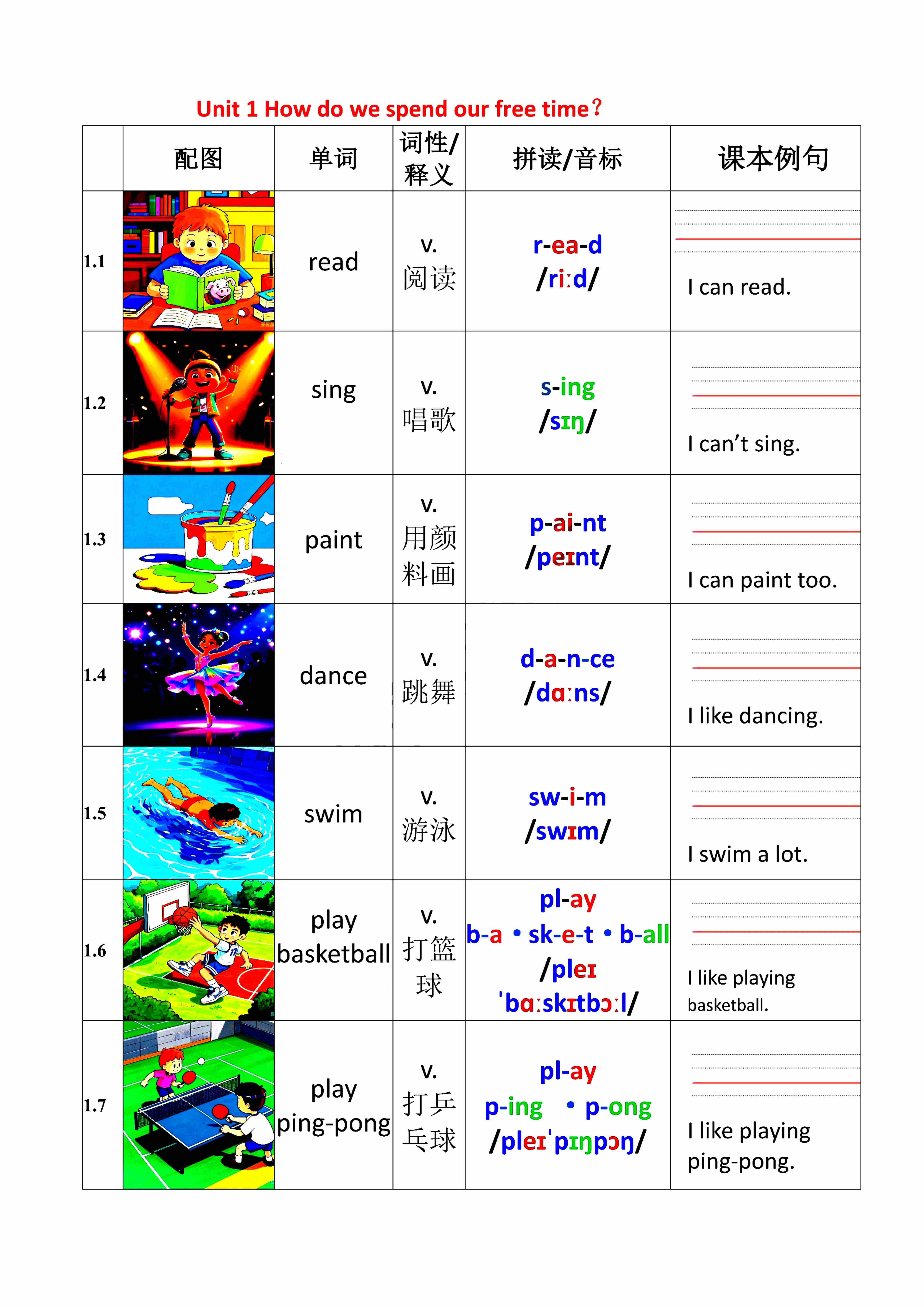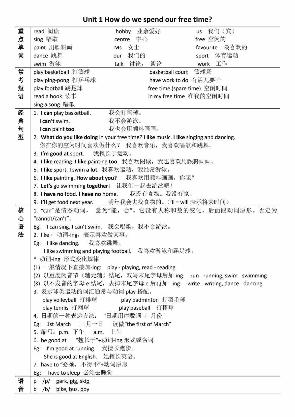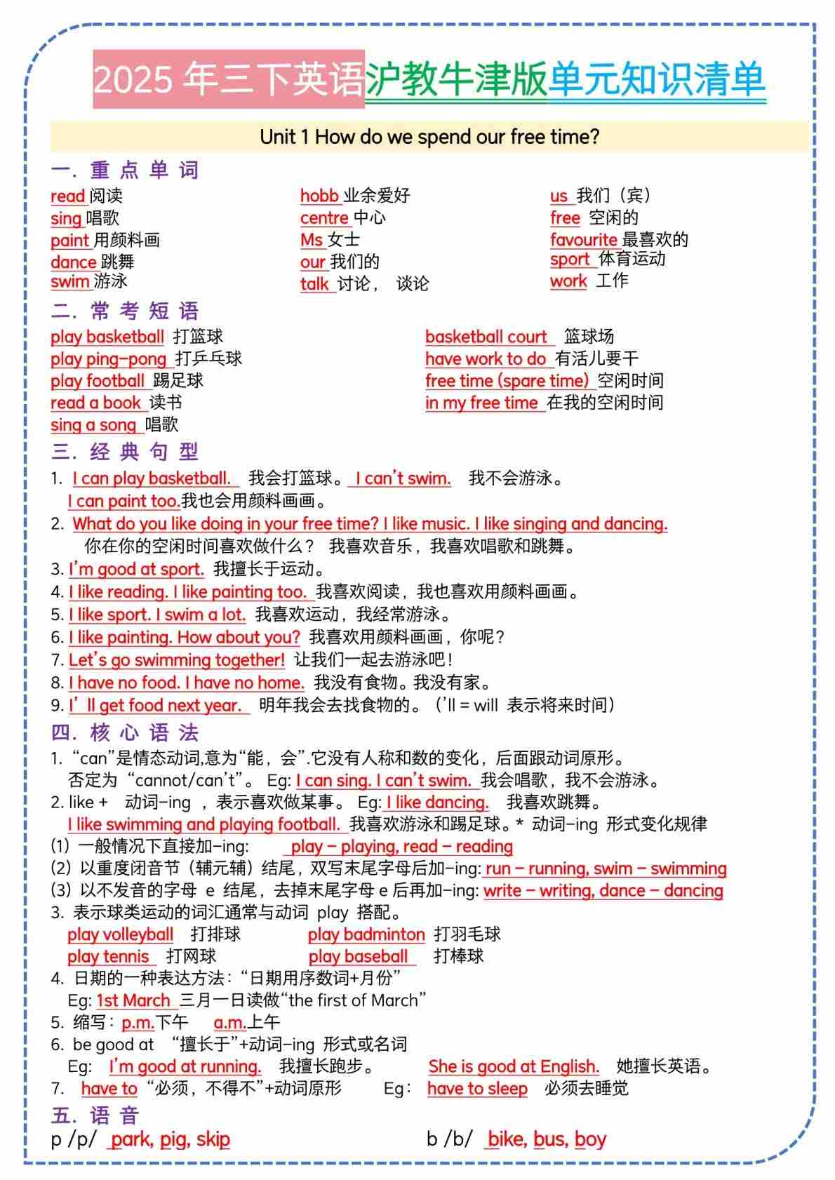 三(下)英语牛津沪教知识清单Unit 1 How do we spend our free ti