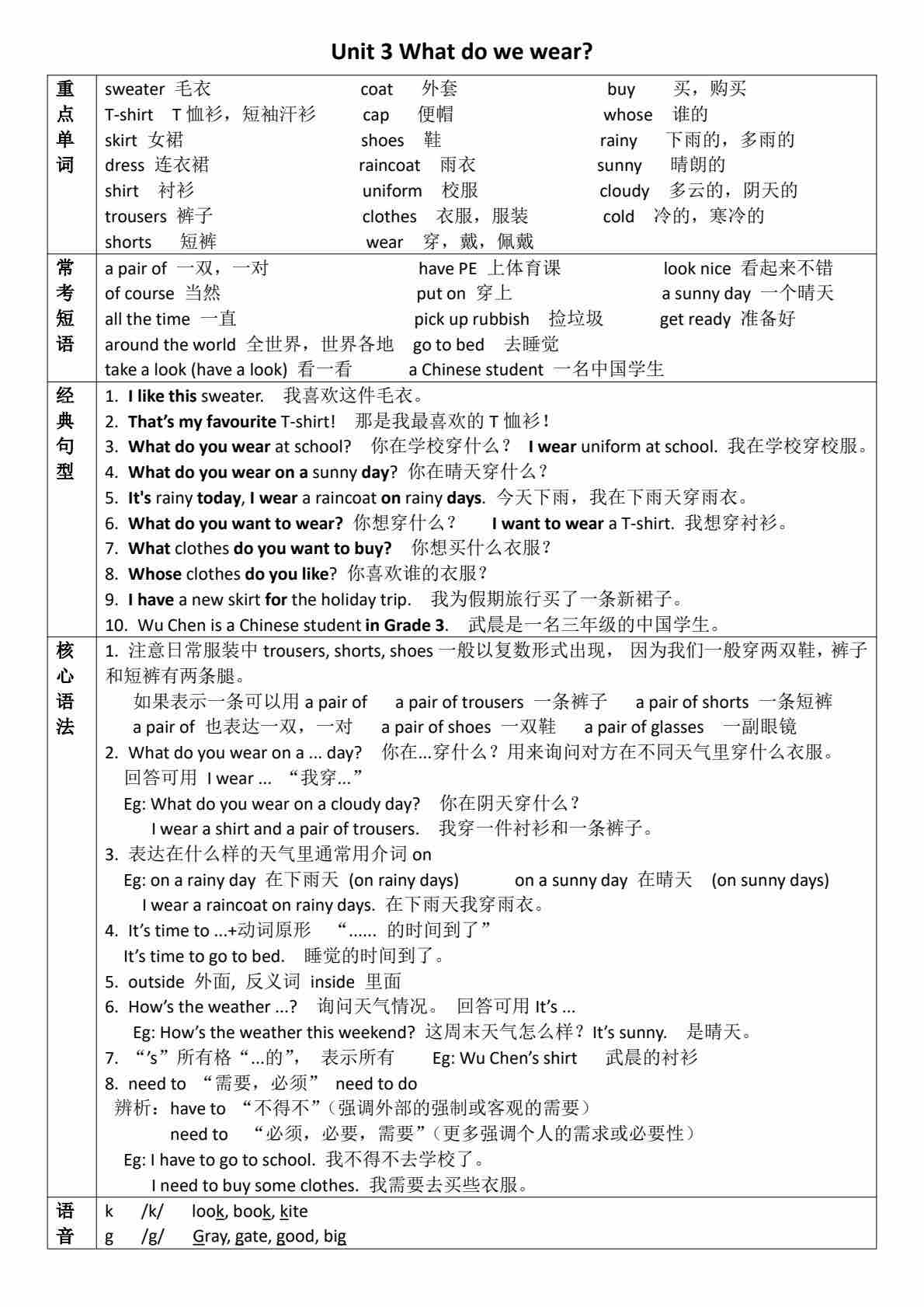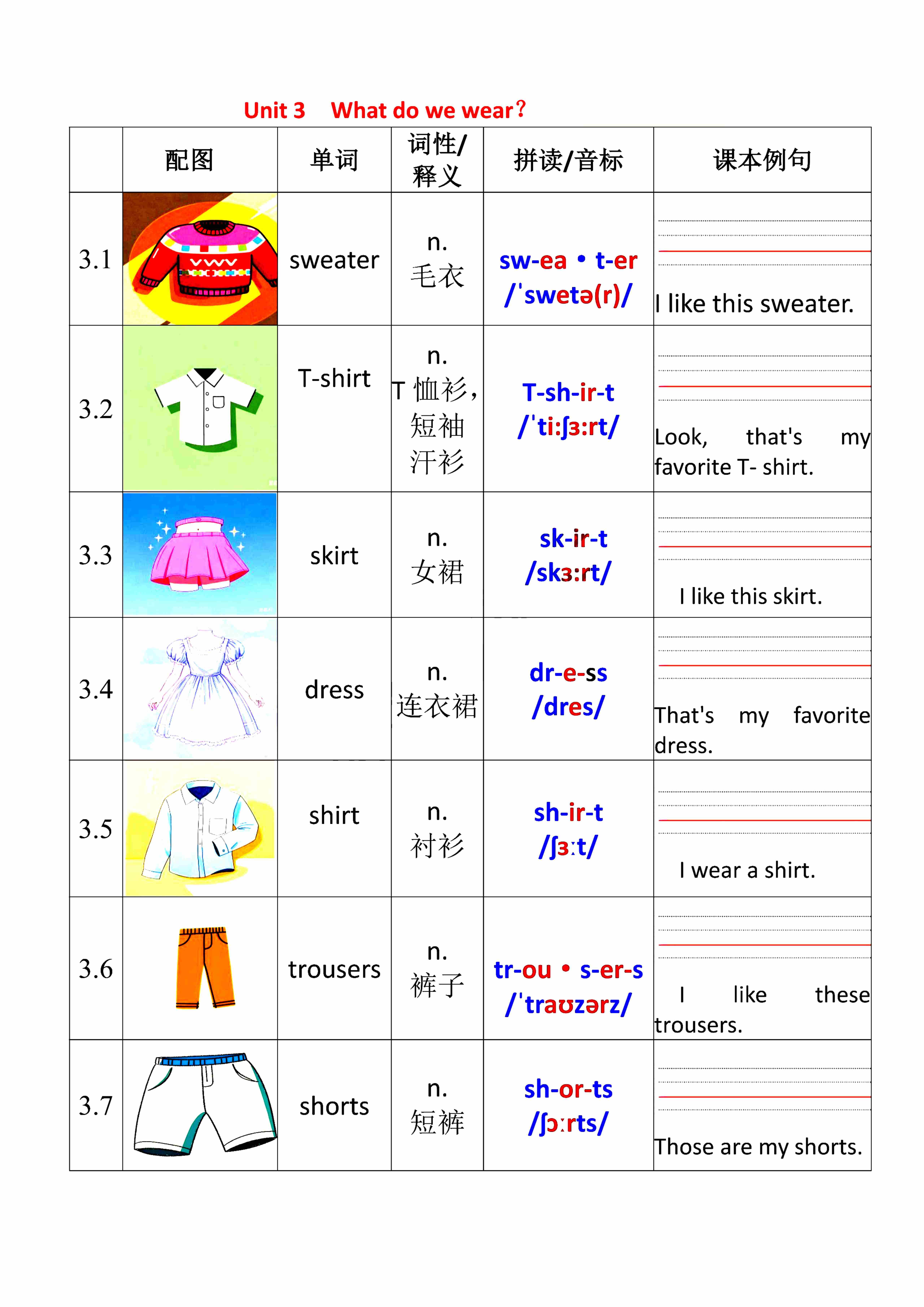 三(下)英语牛津沪教知识清单Unit 3 What do we wear