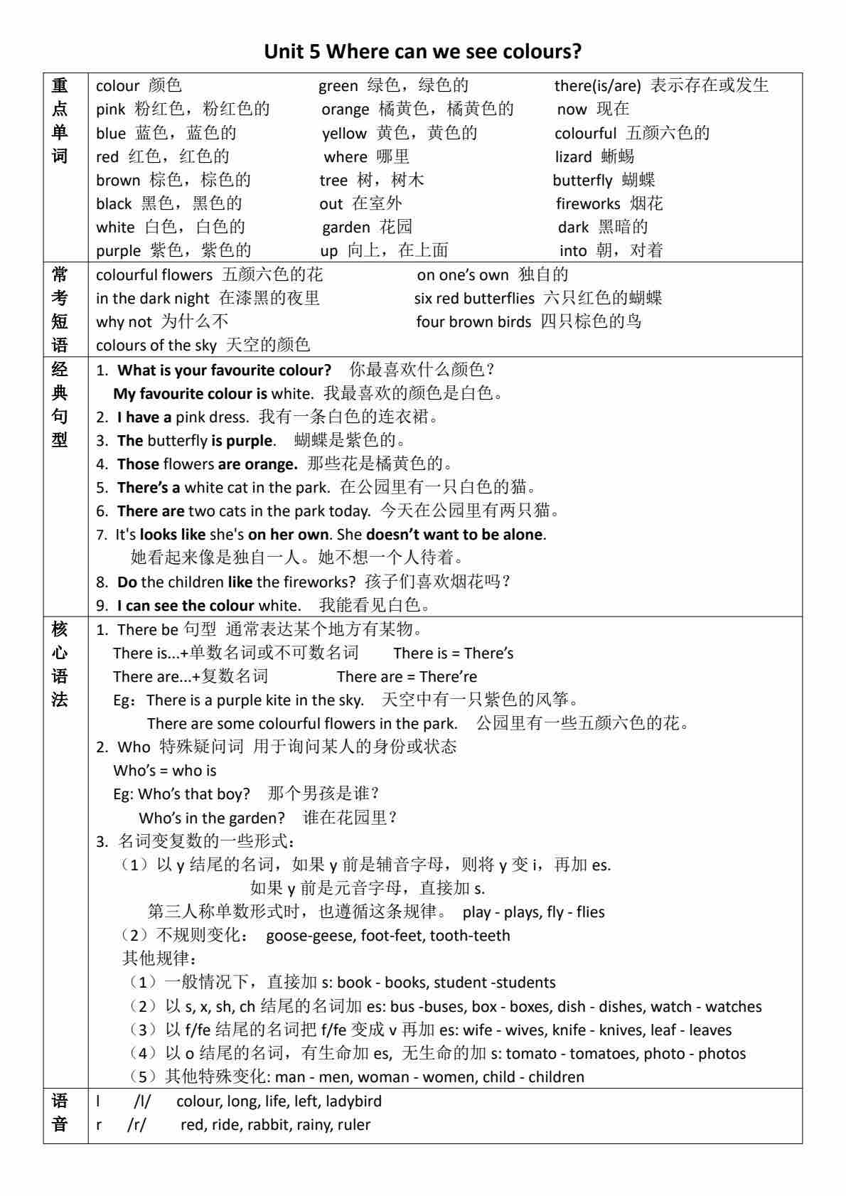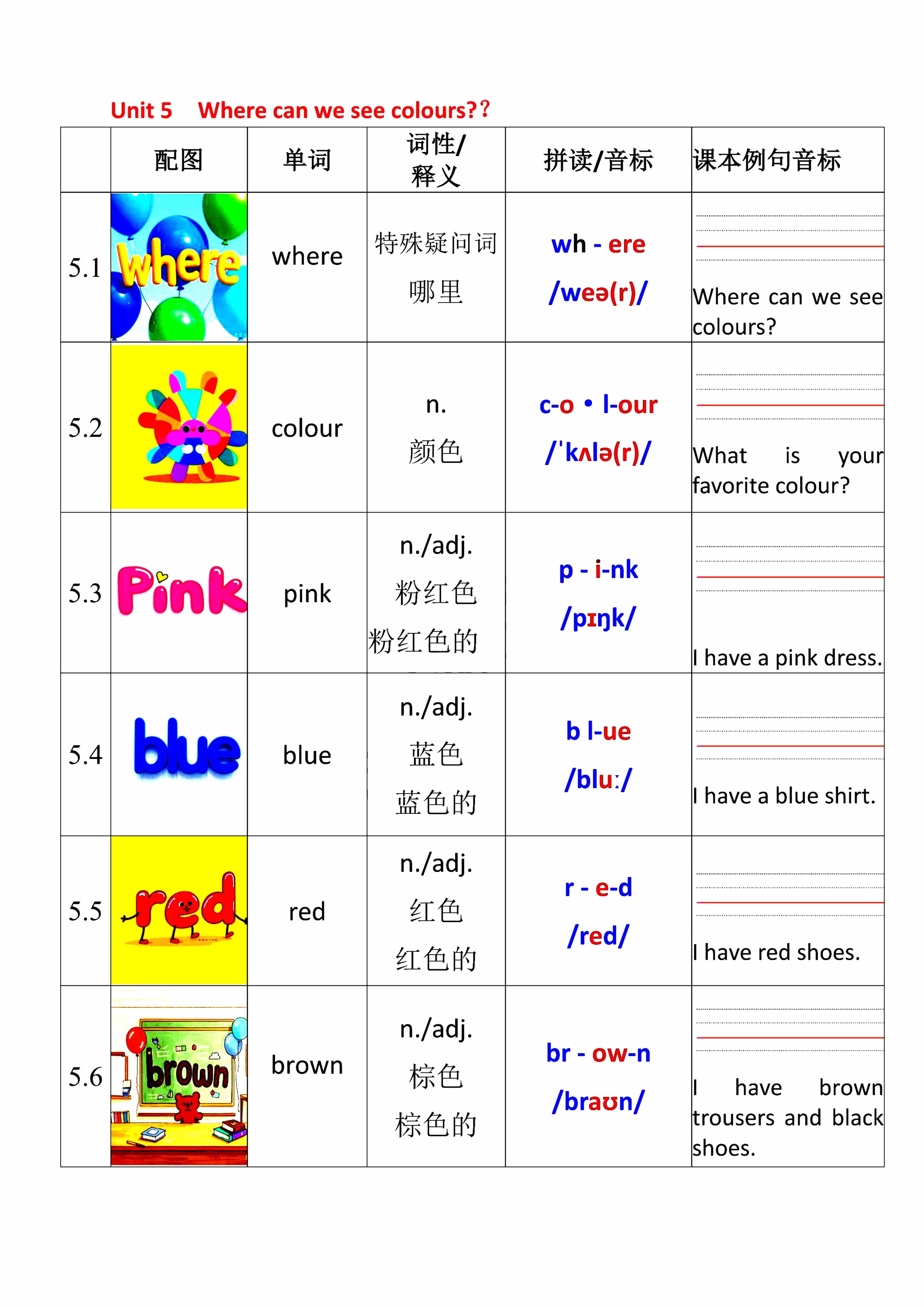 三(下)英语牛津沪教知识清单Unit5 Where can we see colours