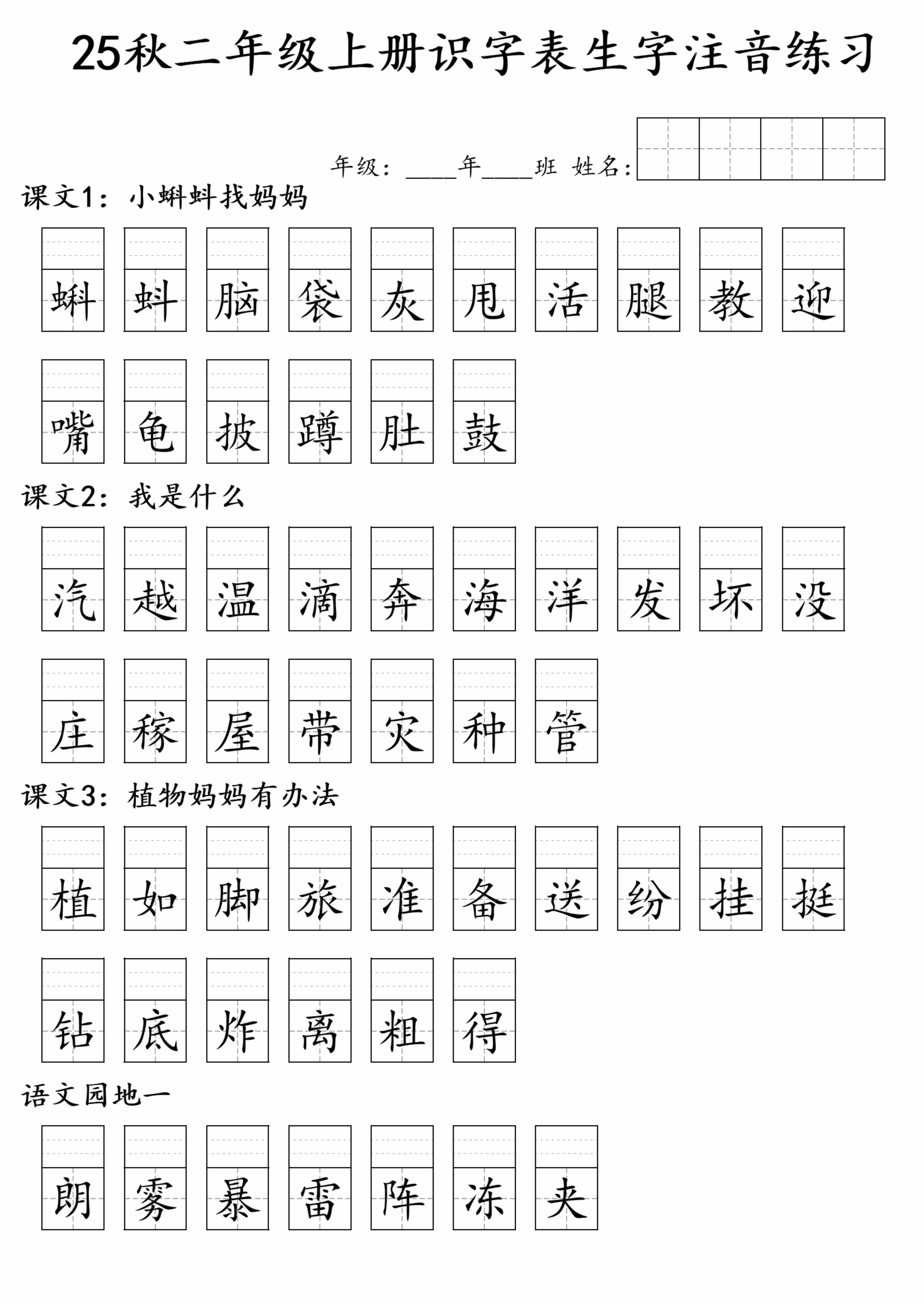 25秋二上语文二类字识字表注音练习(8月份版本)