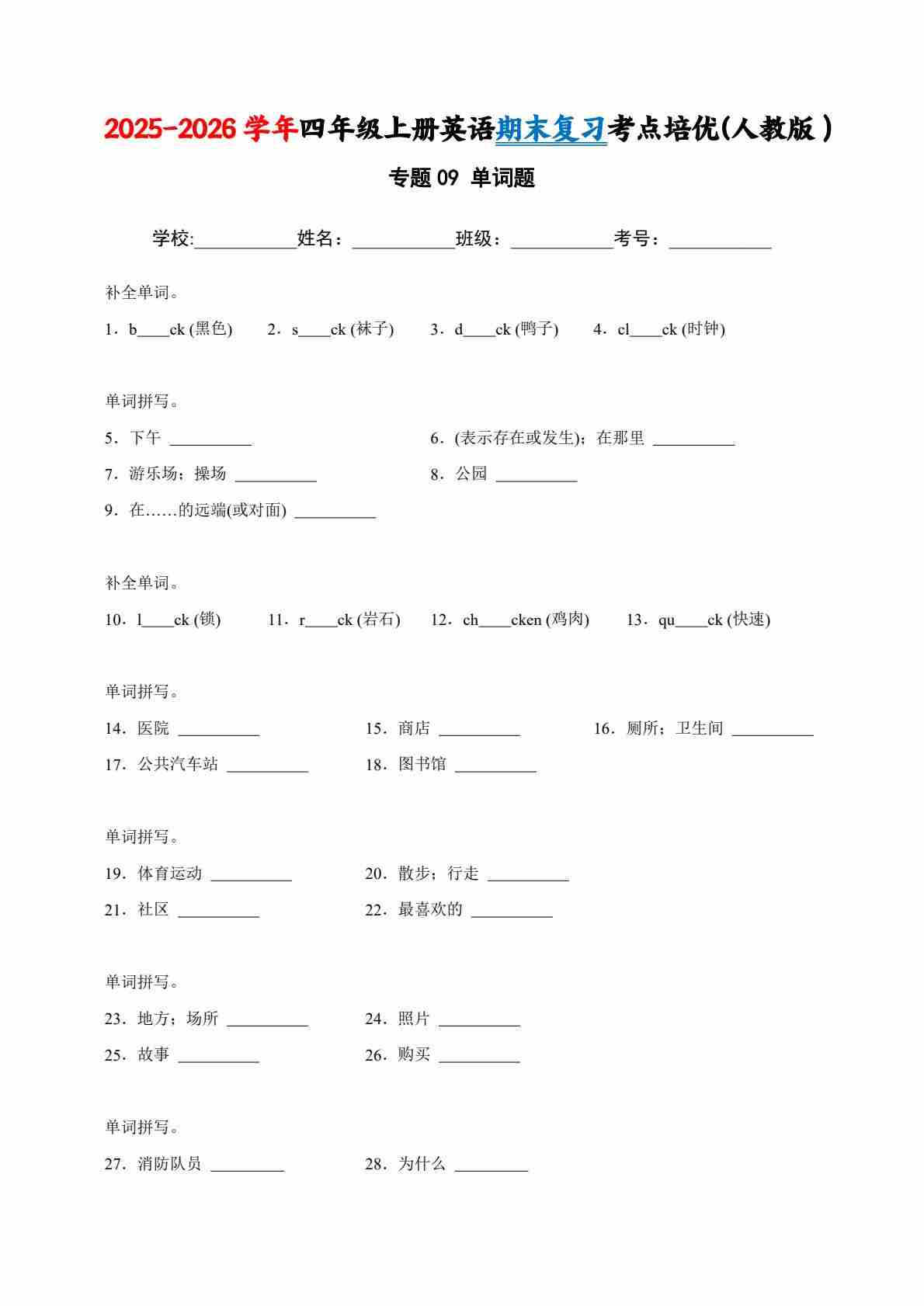 【期末考点培优】专题09 单词题-2025-2026学年四年级英语上册期末复习考点培优人教版(PEP)(含答案解析)