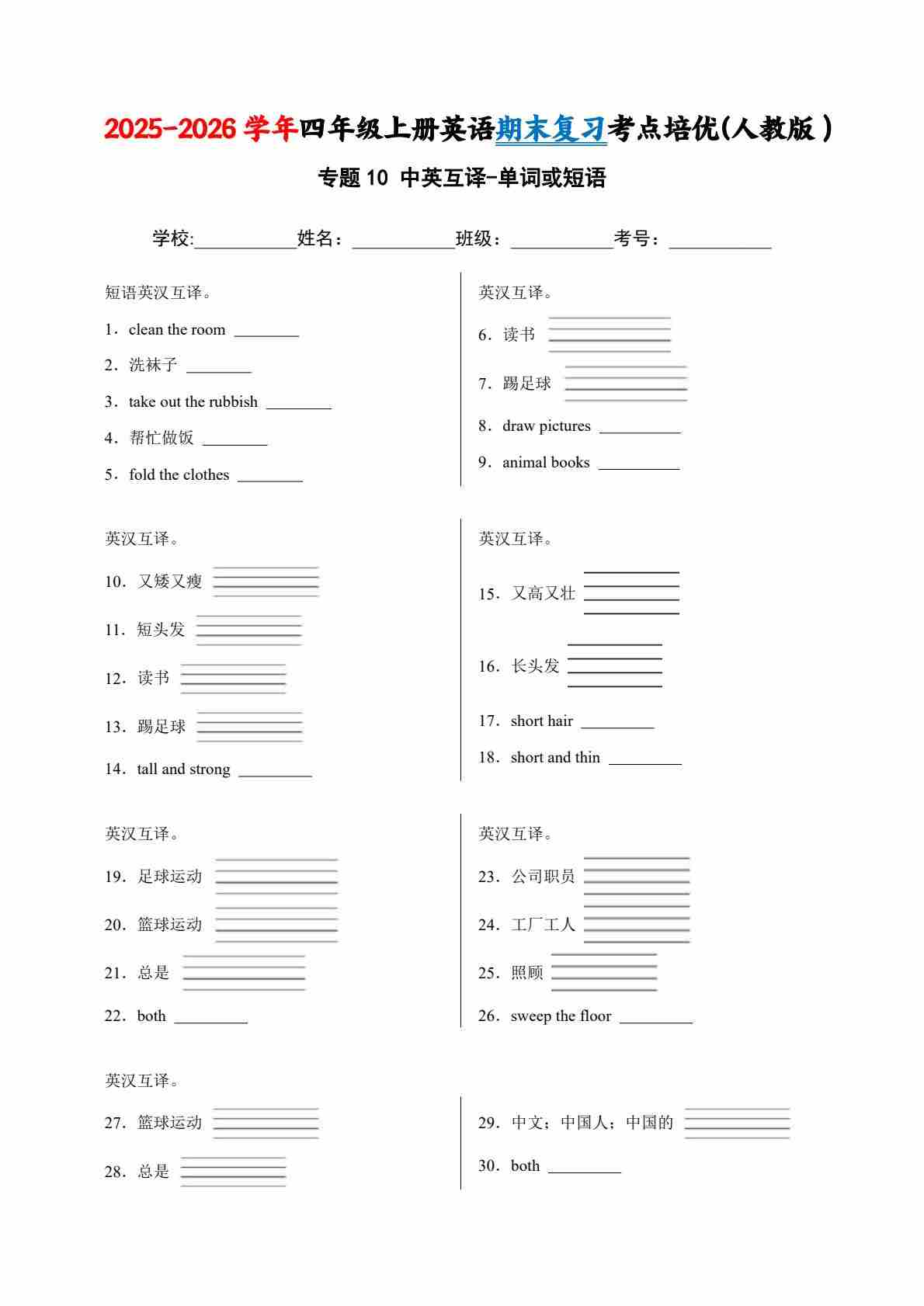 【期末考点培优】专题10 中英互译-单词或短语-2025-2026学年四年级英语上册期末复习考点培优人教版(PEP)(含答案解析)