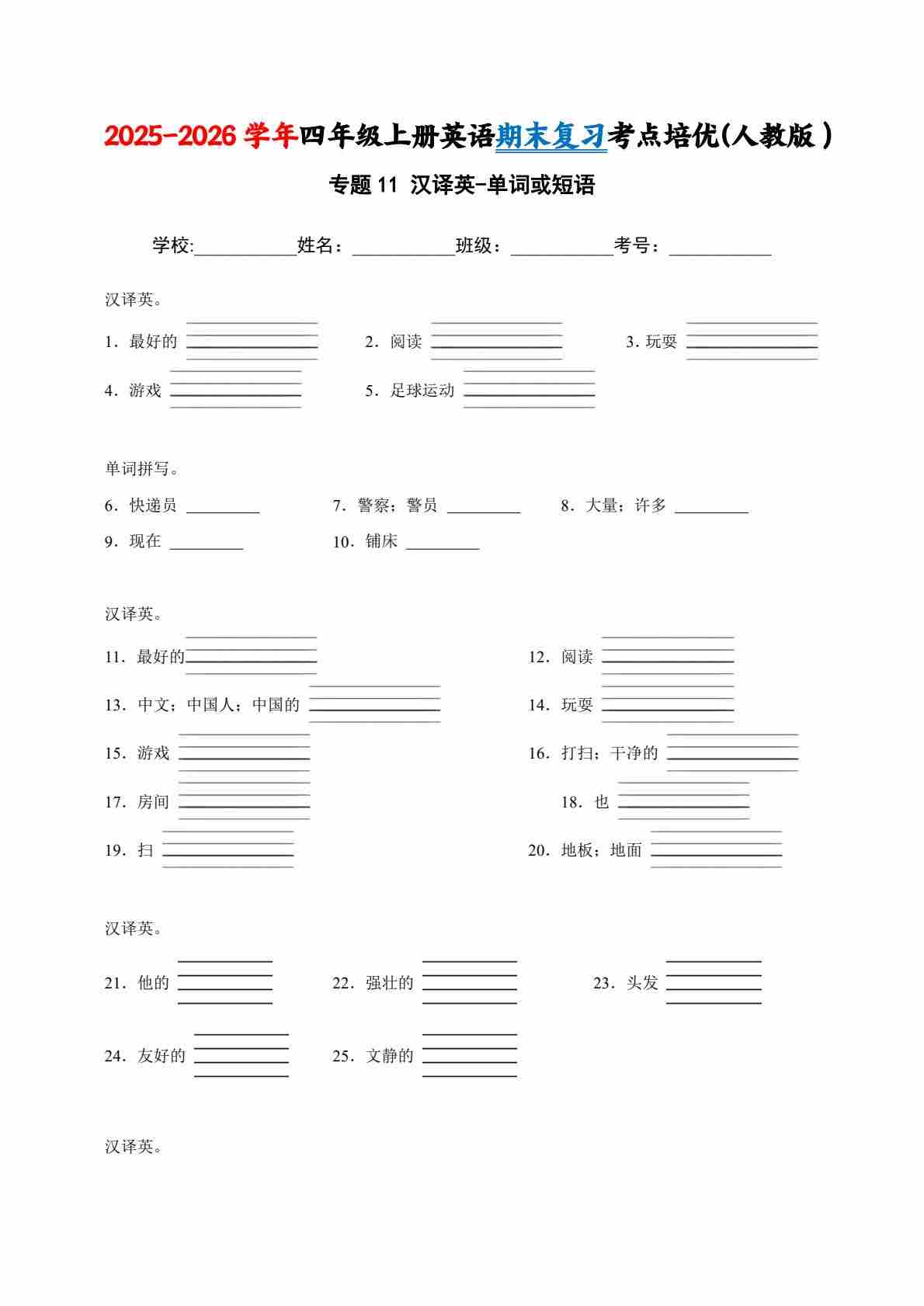【期末考点培优】专题11 汉译英-2025-2026学年四年级英语上册期末复习考点培优人教版(PEP)(含答案解析)