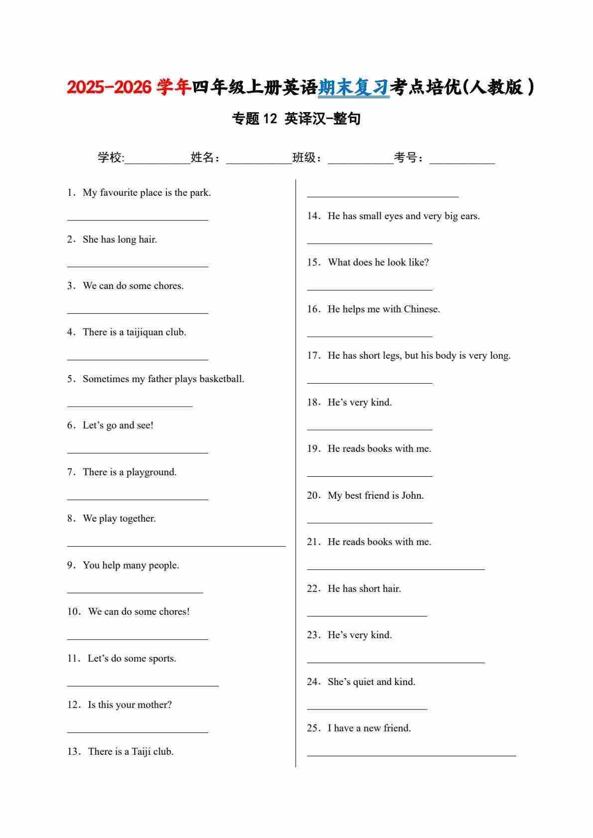 【期末考点培优】专题12 英译汉-整句-2025-2026学年四年级英语上册期末复习考点培优人教版(PEP)(含答案解析)