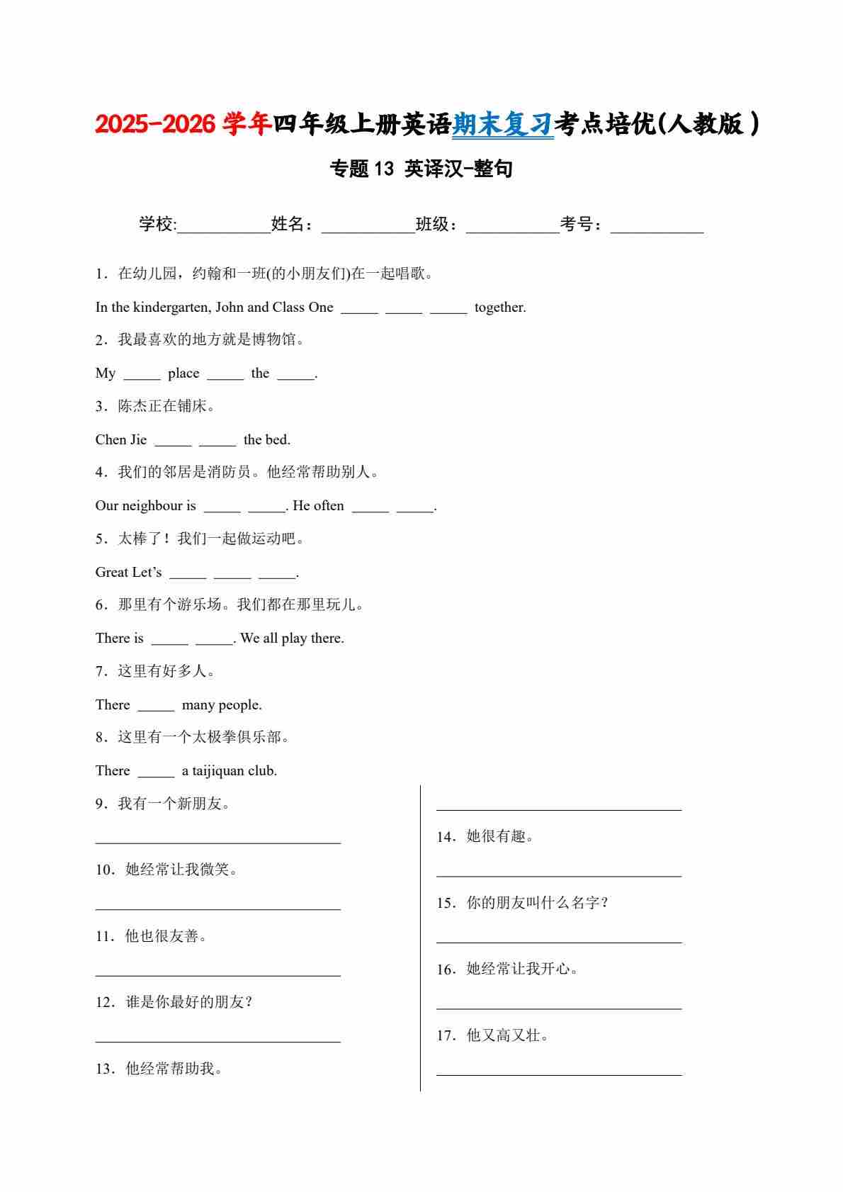 【期末考点培优】专题13 汉译英-整句-2025-2026学年四年级英语上册期末复习考点培优人教版(PEP)(含答案解析)