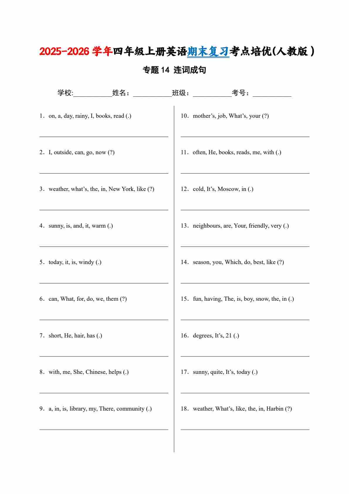 【期末考点培优】专题14 连词成句-2025-2026学年四年级英语上册期末复习考点培优人教版(PEP)(含答案解析)